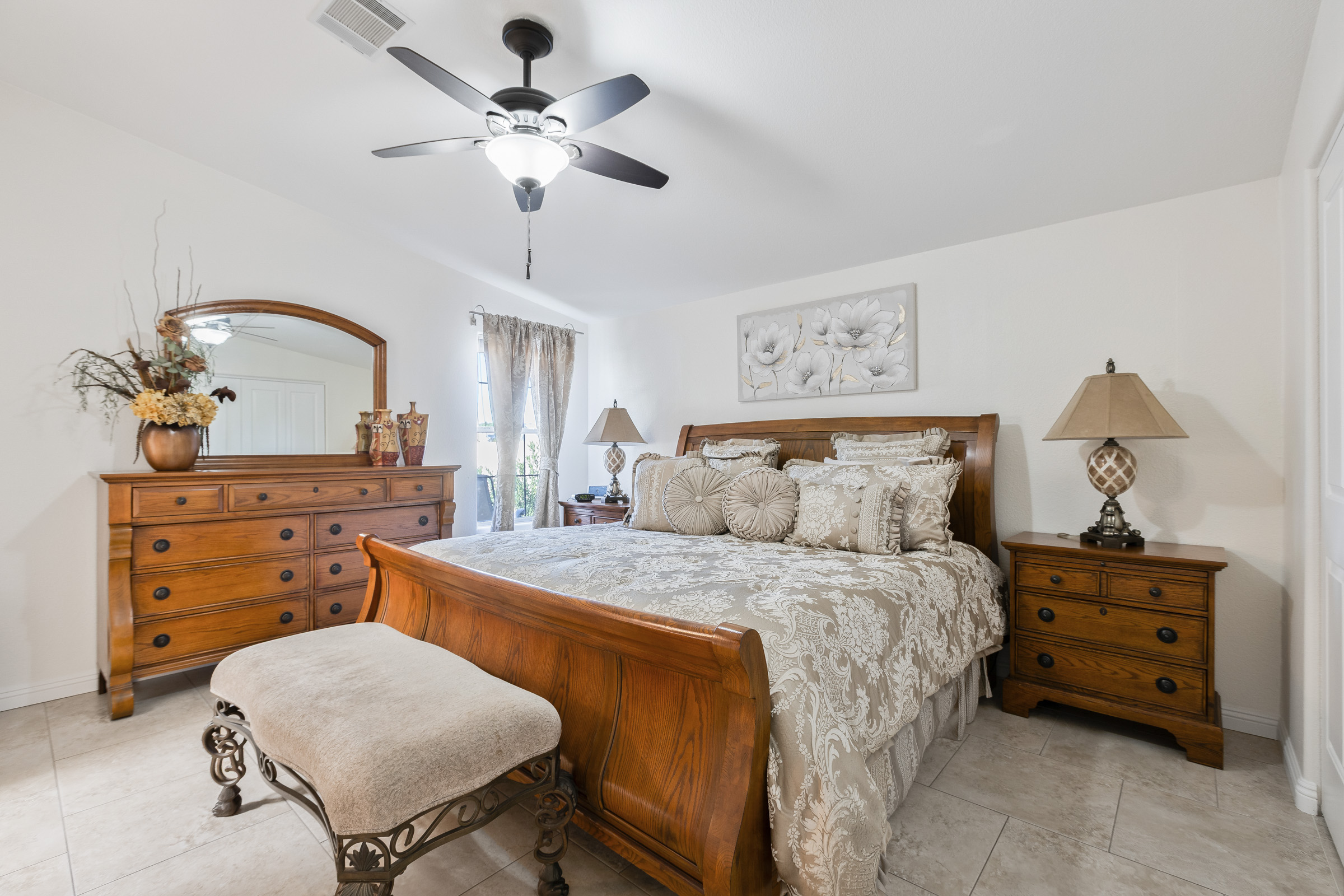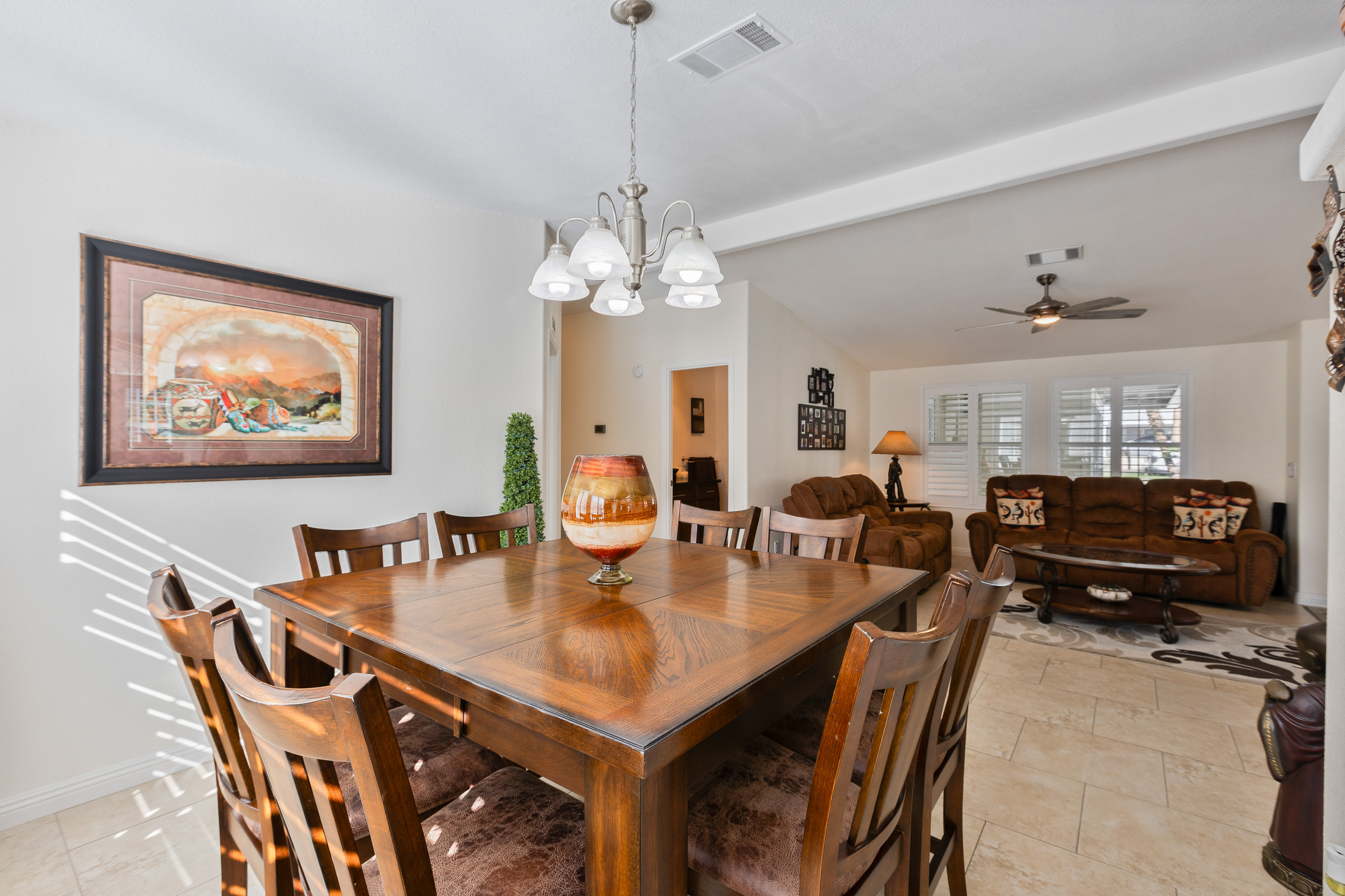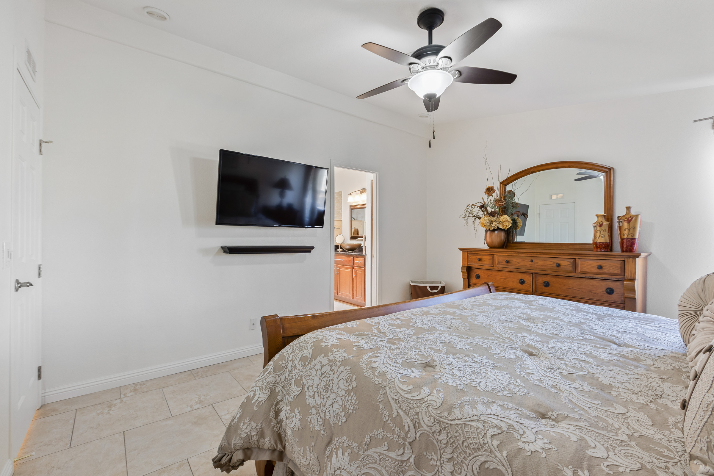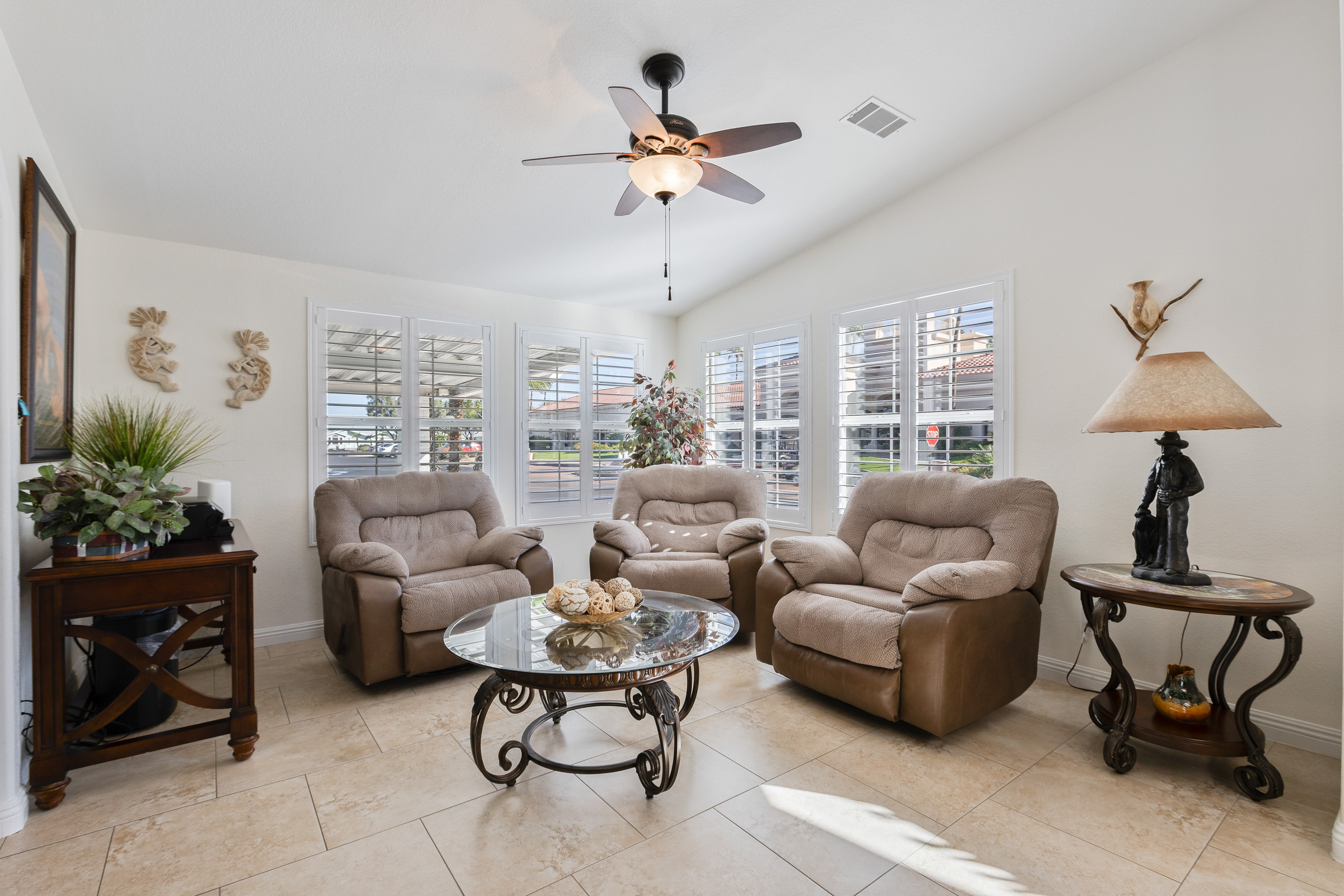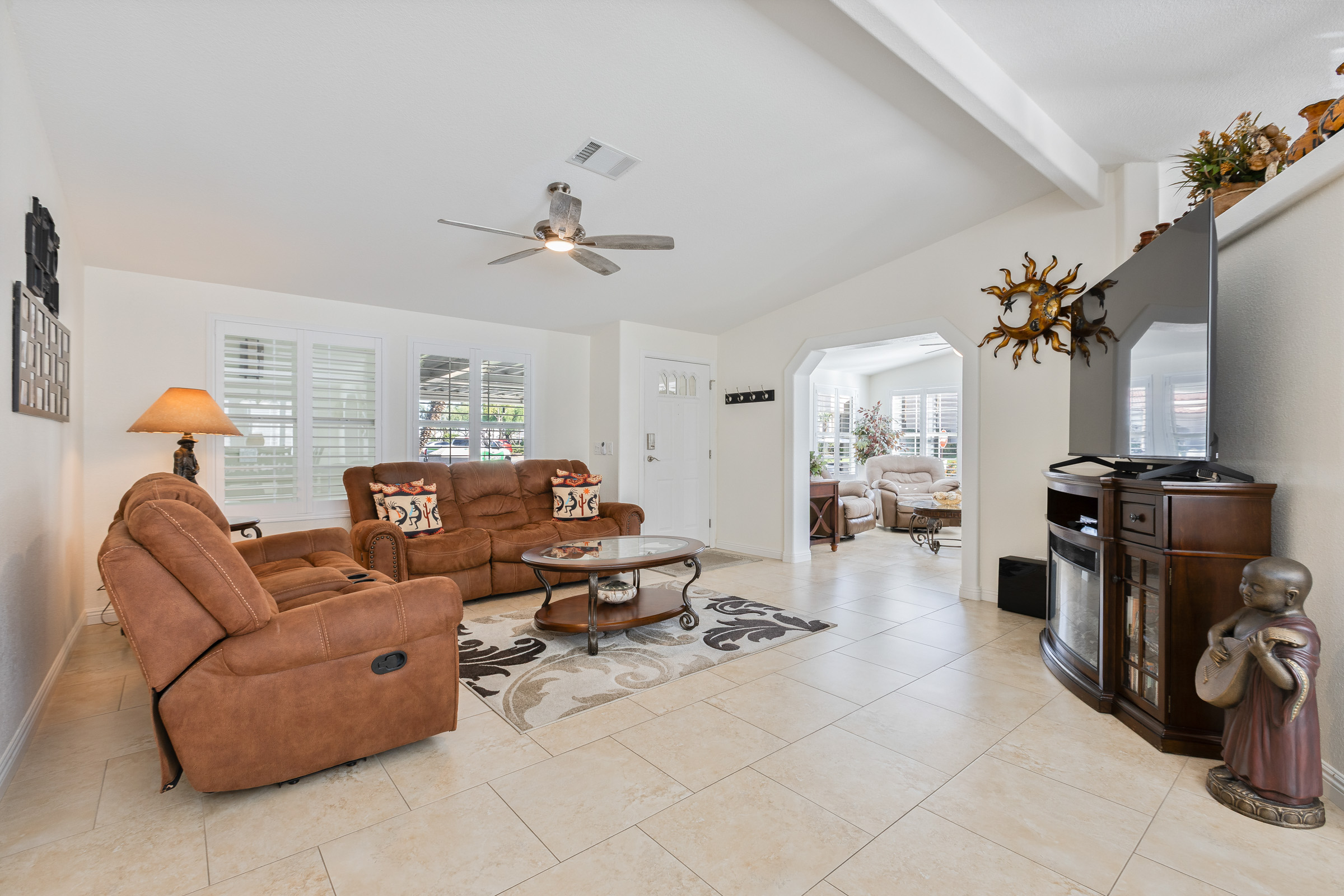 This fully furnished spacious 2BD/2BA home offers a chef’s dream kitchen featuring granite counters, newer cabinets, double ovens, dual dishwashers, an addl extra-large SXS fridge/freezer, & a huge island with storage. Fully tiled throughout, it features elegant living and family rooms. The primary suite includes a luxurious closet/dressing room approx 10×10 sf, and walk-in nonslip shower. Enjoy greenbelt and clubhouse views, a serene back patio, corner location, two-car garage, two-car SxS carport, and even a new roof coming soon.