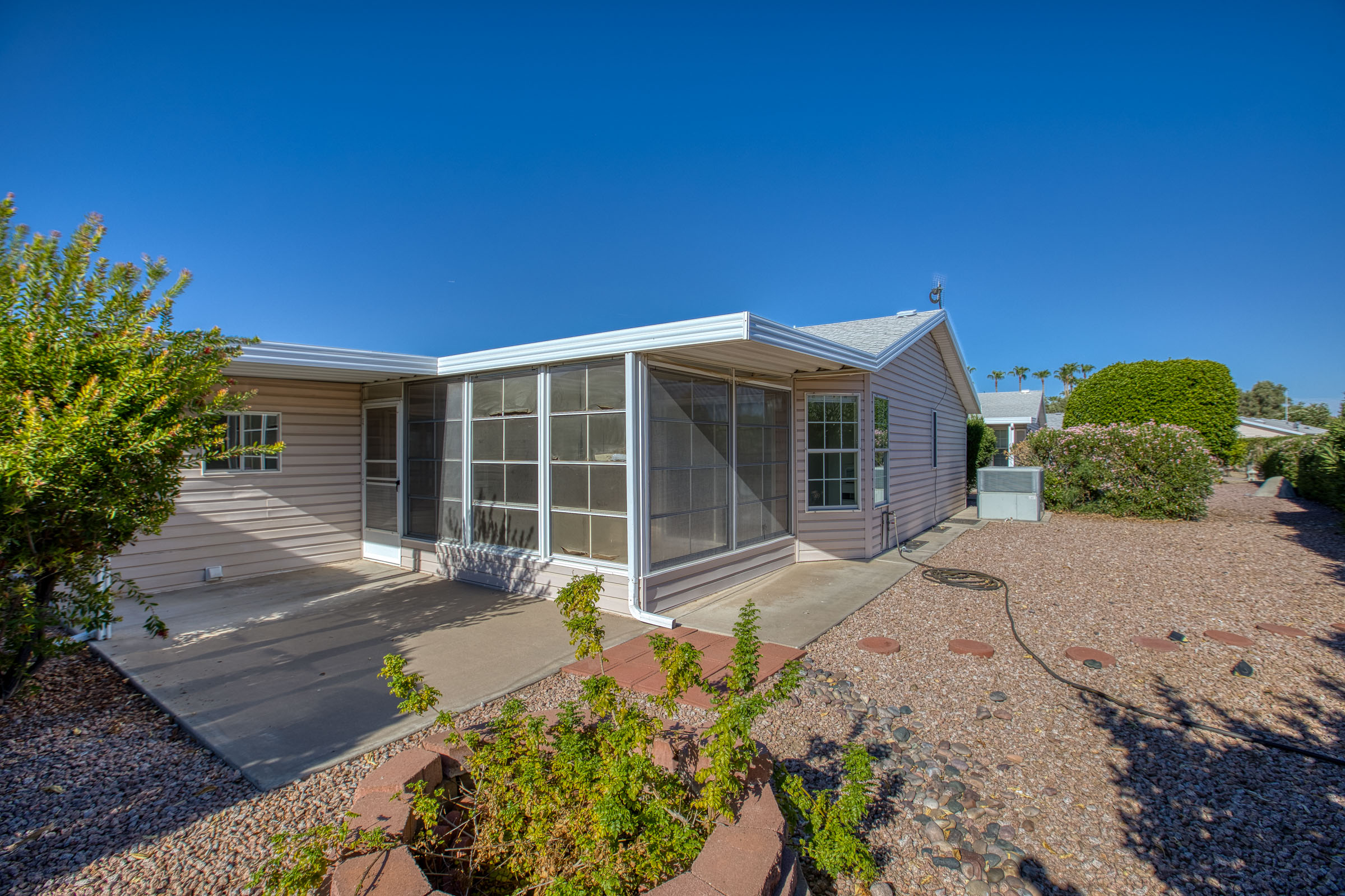A beautiful 2-bedroom/2-bath home with a den is move-in ready and very close to the clubhouse/pool. The split floorplan features a guestroom-side den, plus an updated AZ room off the eat-in kitchen. The new kitchen cabinets & quartz countertops are stunning. The primary bedroom fits a king-size set and includes an en suite bathroom with a new large tub/shower and a walk-in closet. Just off the enclosed AZ room, both an open & a covered semiprivate patio area makes for the finishing touch to this charming home.