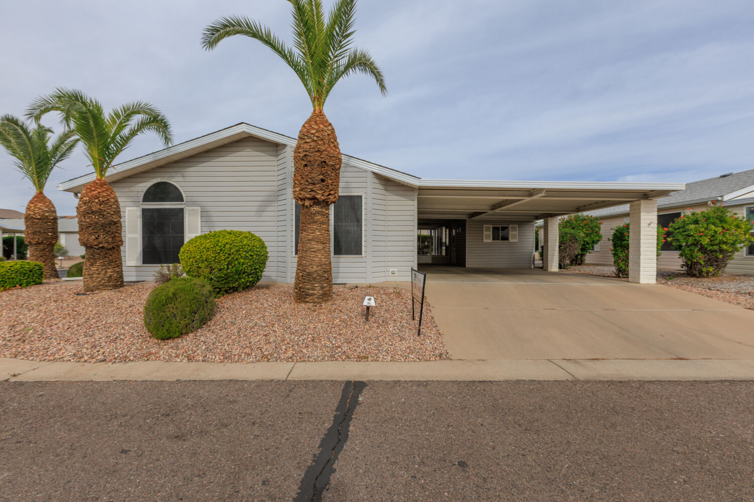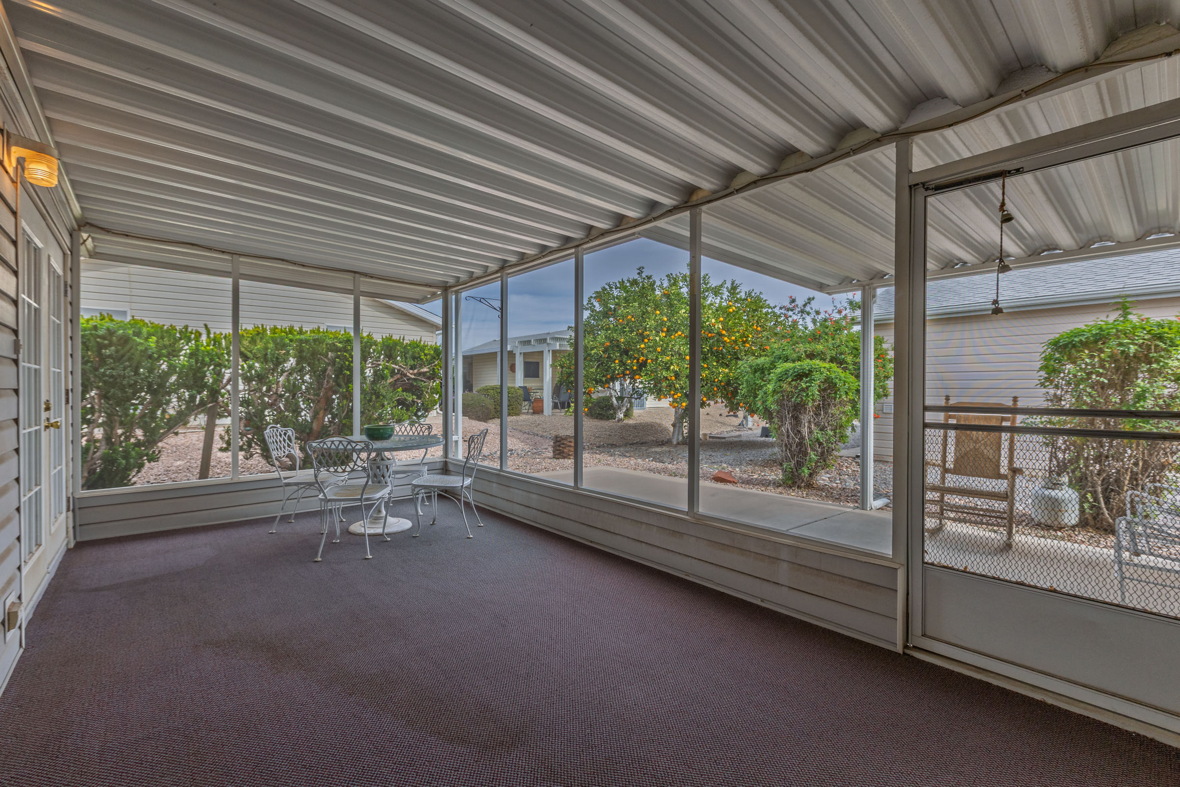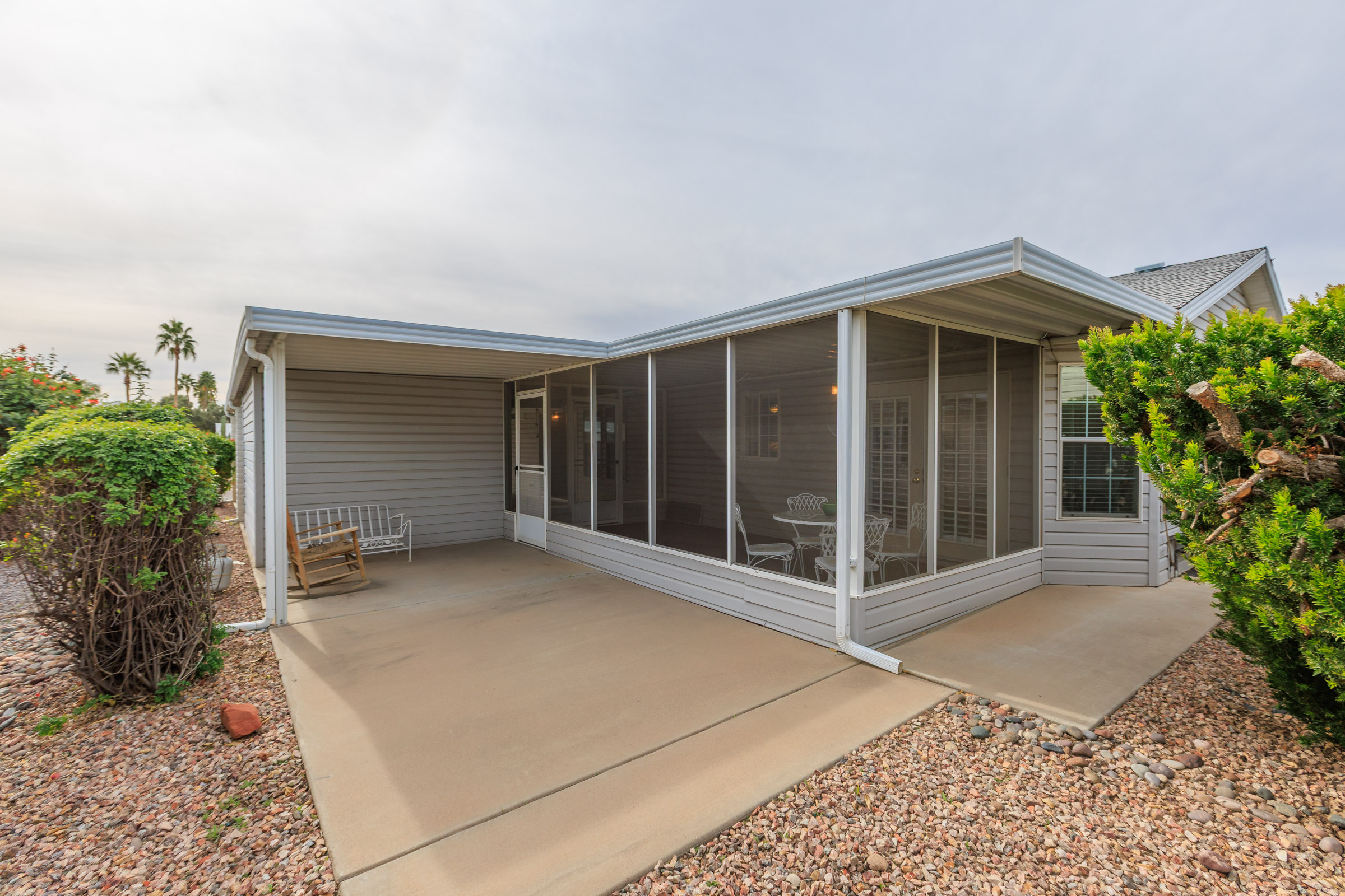 Enjoy this fully furnished 2bd/2 ba split floorplan home with a versatile den. The cathedral ceilings and stylish accent walls really bring charm and sophistication. Upgraded flooring complements a modern kitchen featuring granite countertops, stainless steel appliances, and an eat in breakfast nook. Relax outdoors on the screened in porch, covered & open patio. Added conveniences include a private storage room and side by side carport parking for easy daily living, perfectly blending comfort, style, functionality, and convenience in this retreat.