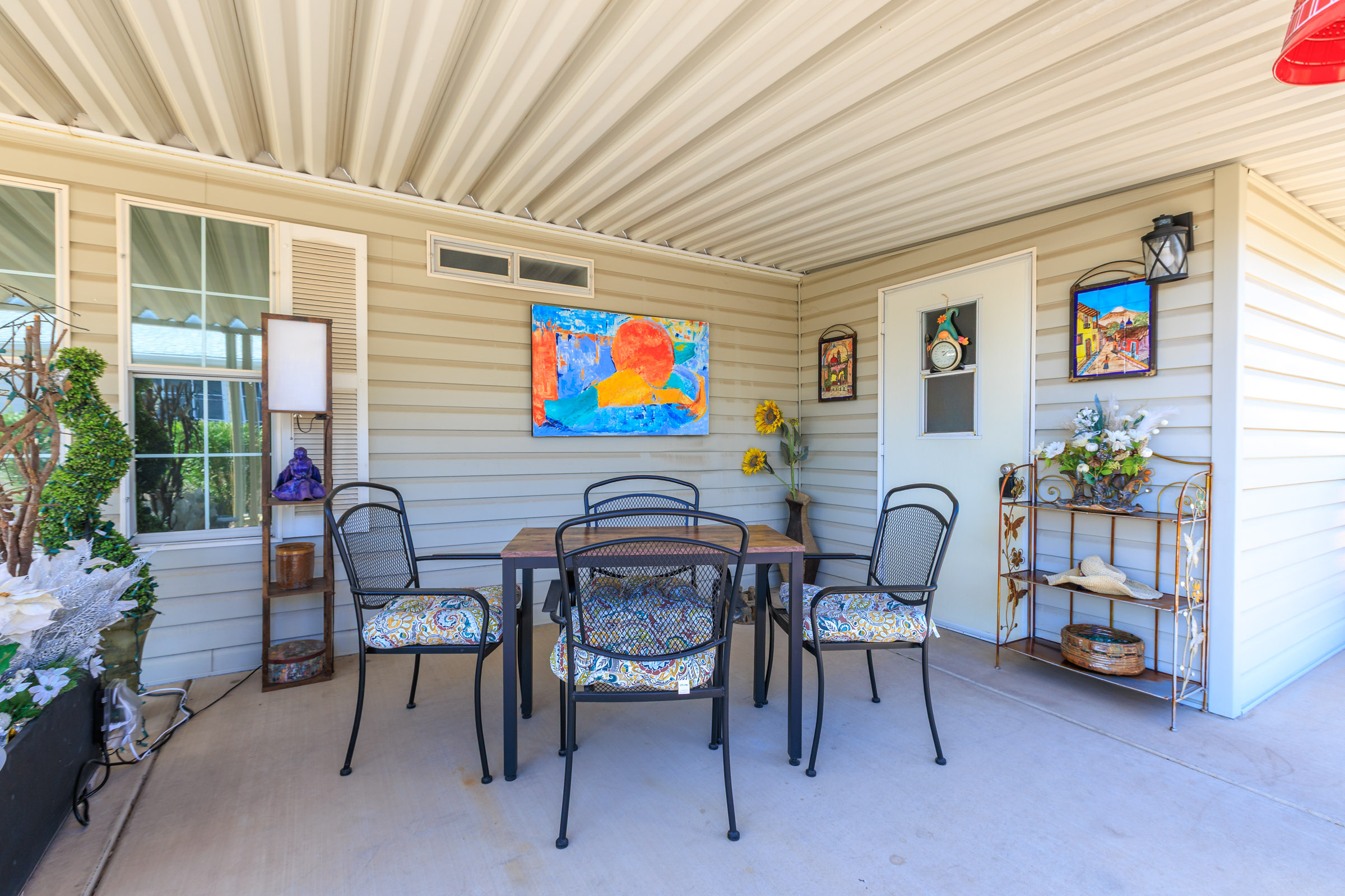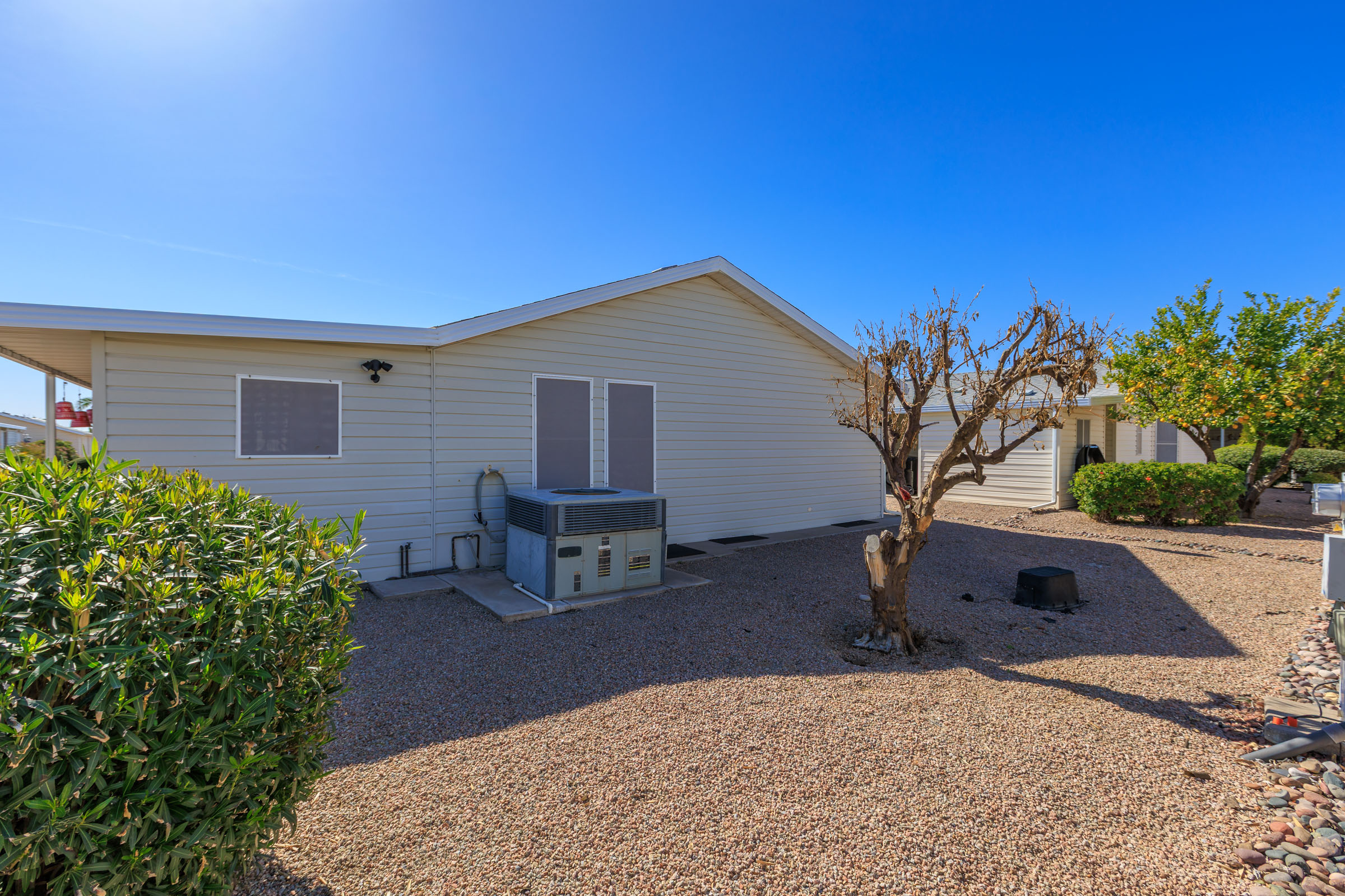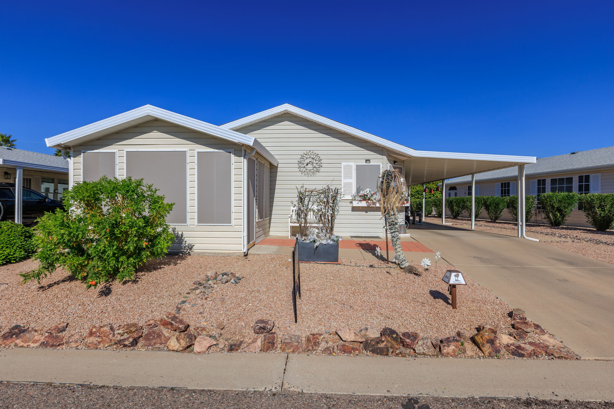 Spacious 2bd/2ba home featuring an enclosed, climate-controlled & tiled Arizona room that adds versatile living space—ideal for a den or home office. The kitchen offers a wraparound breakfast bar, while the dining room opens seamlessly to the living room for easy entertaining. Laundry is conveniently located inside the home. The primary bedroom accommodates a king-sized bed and includes a walk-in closet and a large en suite bath with a step-in shower. The guest bedroom effortlessly doubles as a bright craft room or an art studio with extra storage and additional lighting. An open front patio and a spacious storage shed, completes this darling home.