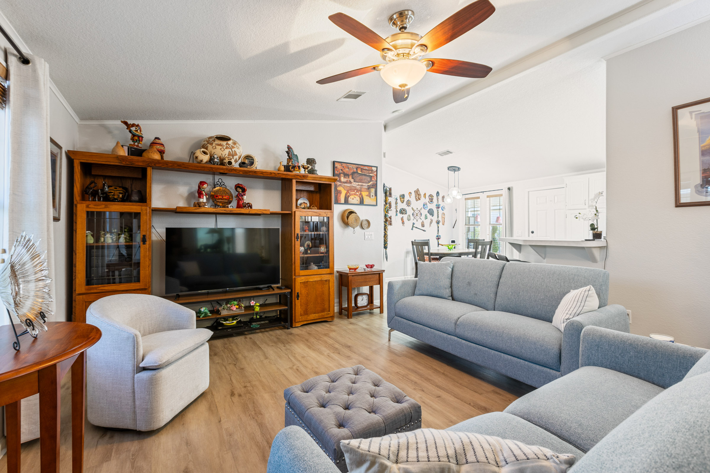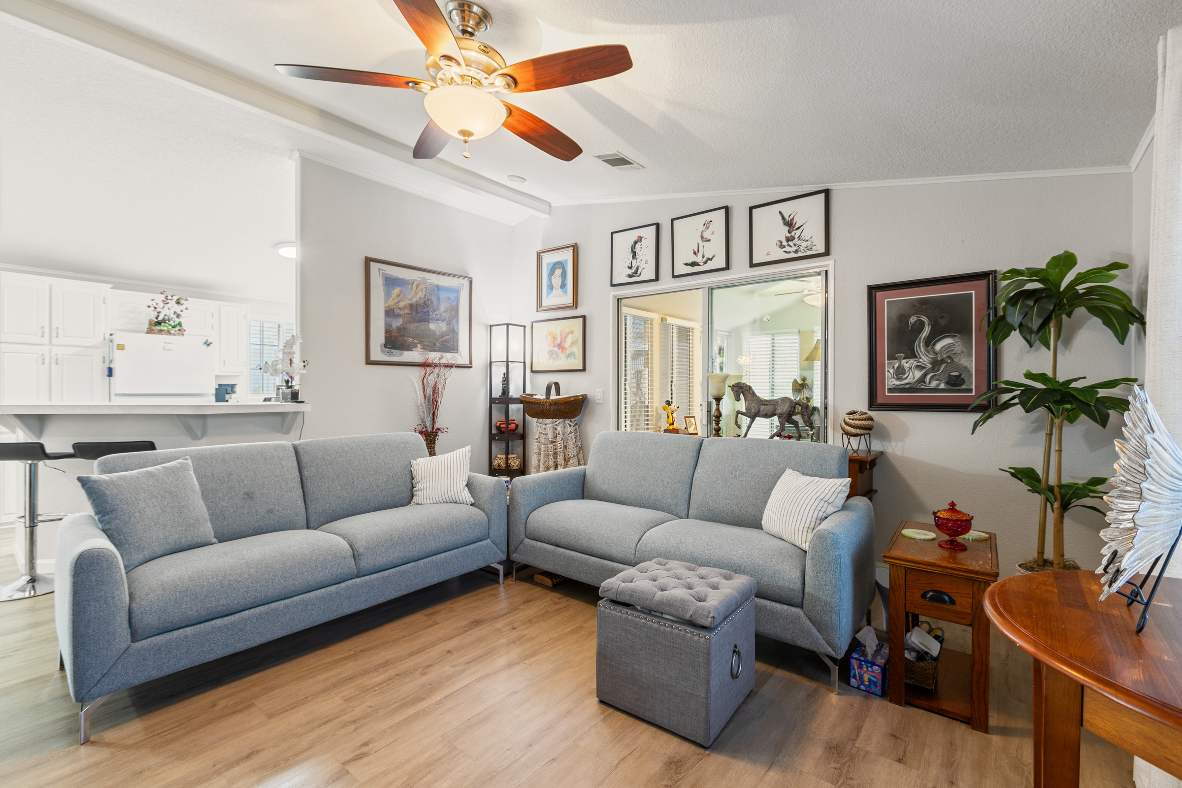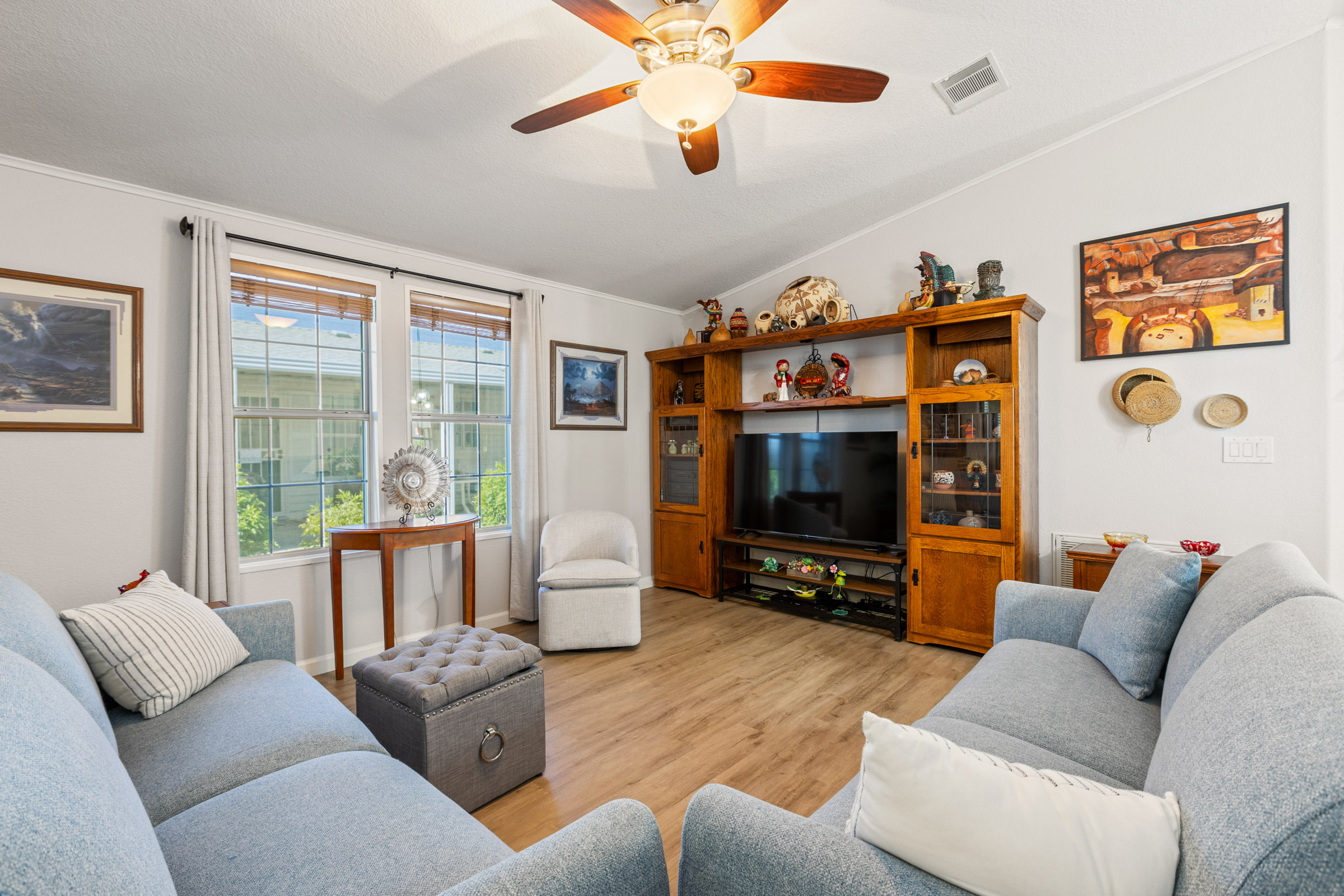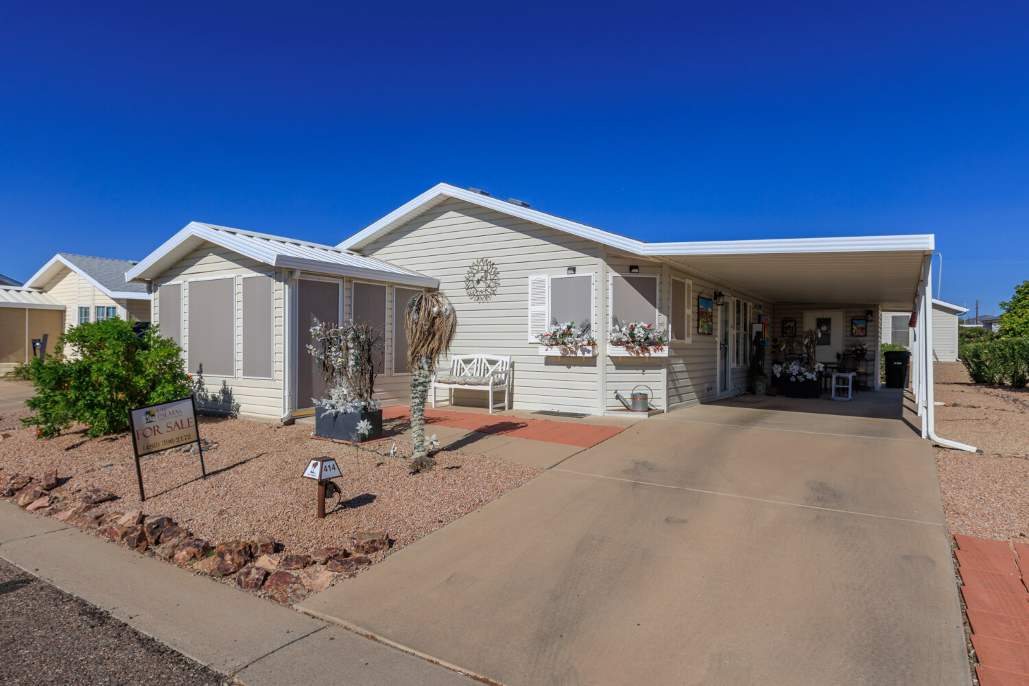 Spacious 2bd/2ba home featuring an enclosed, climate-controlled & tiled Arizona room that adds versatile living space—ideal for a den or home office. The kitchen offers a wraparound breakfast bar, while the dining room opens seamlessly to the living room for easy entertaining. Laundry is conveniently located inside the home. The primary bedroom accommodates a king-sized bed and includes a walk-in closet and a large en suite bath with a step-in shower. The guest bedroom effortlessly doubles as a bright craft room or an art studio with extra storage and additional lighting. An open front patio and a spacious storage shed, completes this darling home.