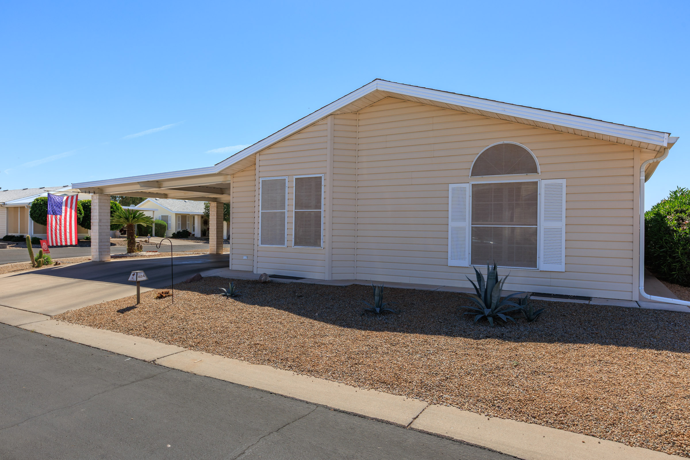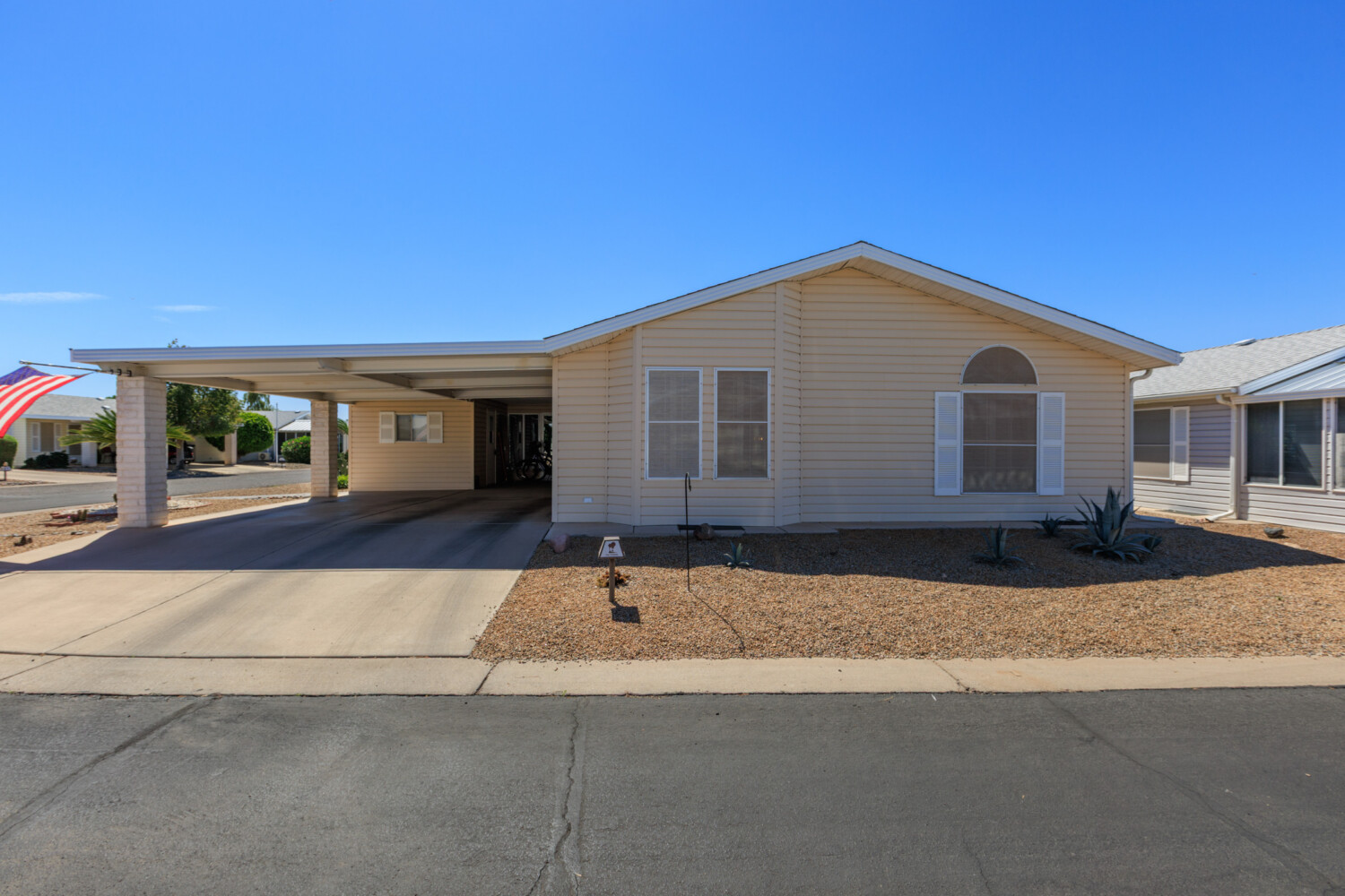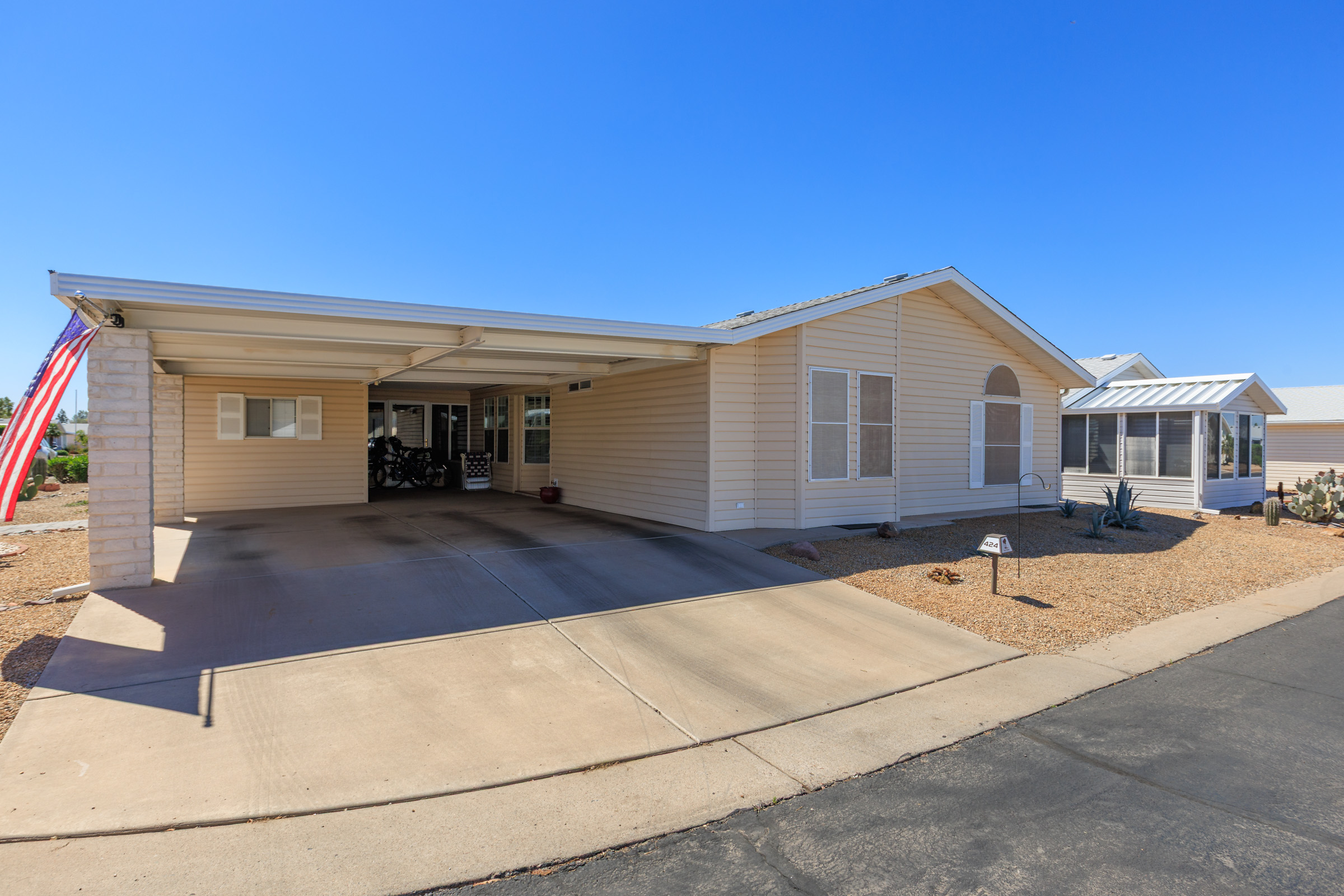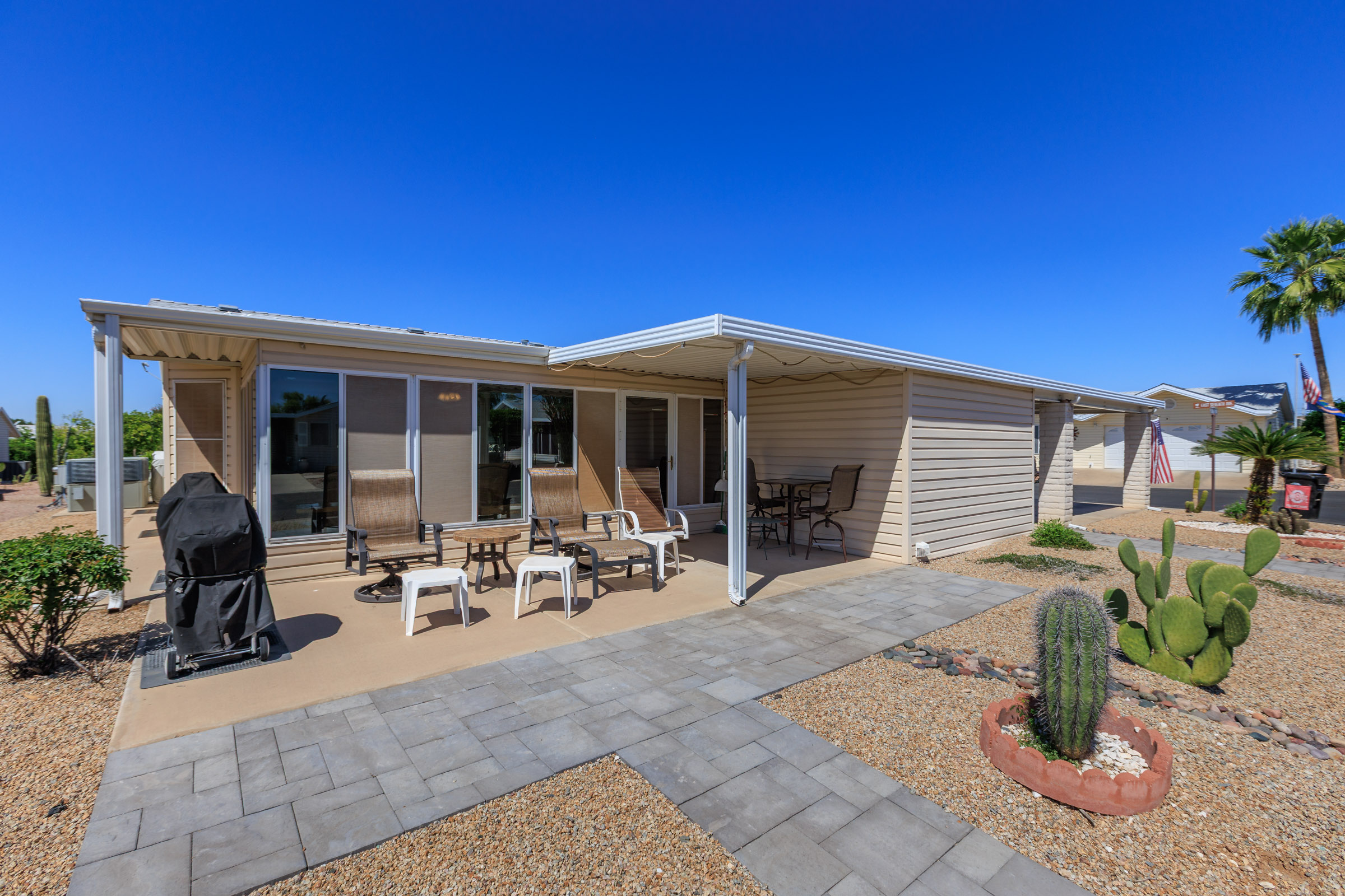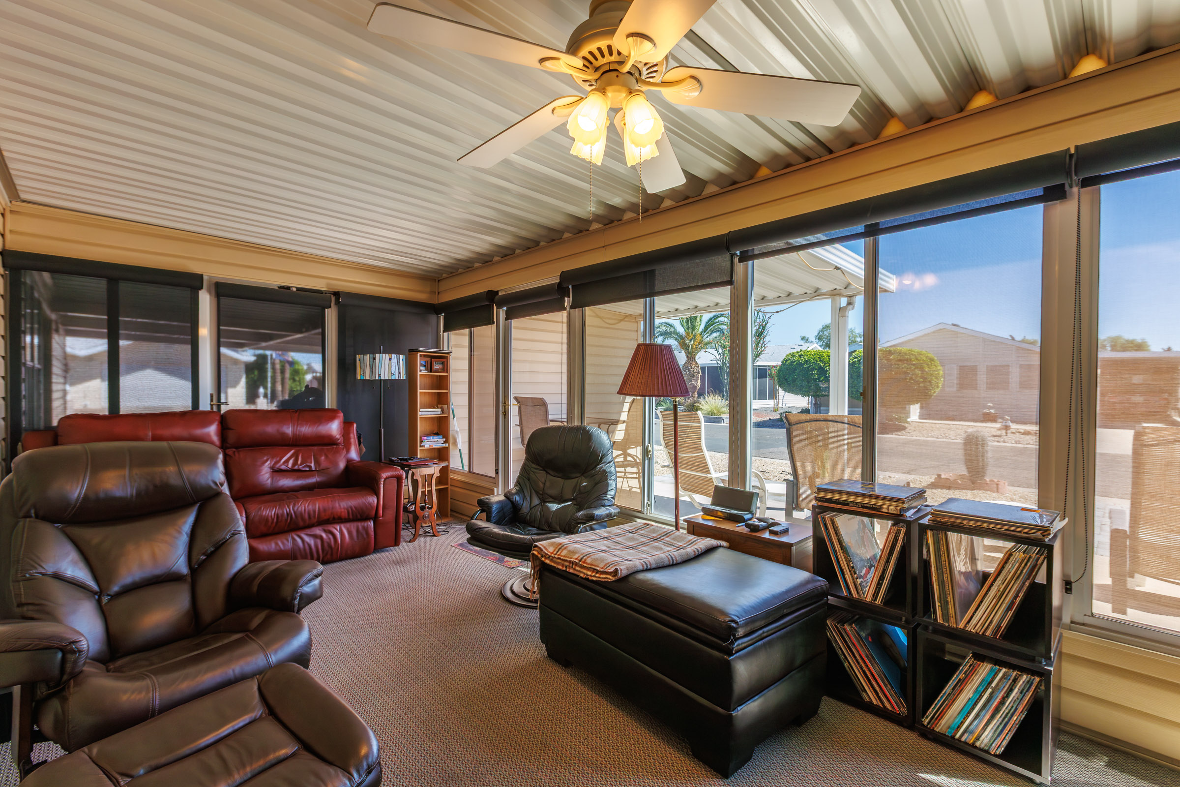 Spacious 2BD/2BA home with a den and highly desirable split floor plan. Plantation shutters, beautiful flooring, and freshly painted rooms in chic tones create a modern feel. The kitchen features sleek black appliances, while the spacious primary suite accommodates a king-size set. Additional highlights include indoor laundry, updated easy access showers, a glassed-in Arizona room with blackout shades, and a large outdoor space with a partially covered patio, perfect for relaxing or entertaining.