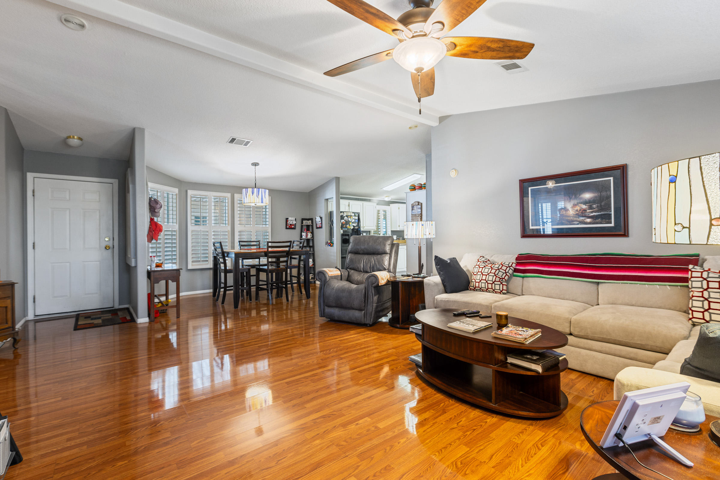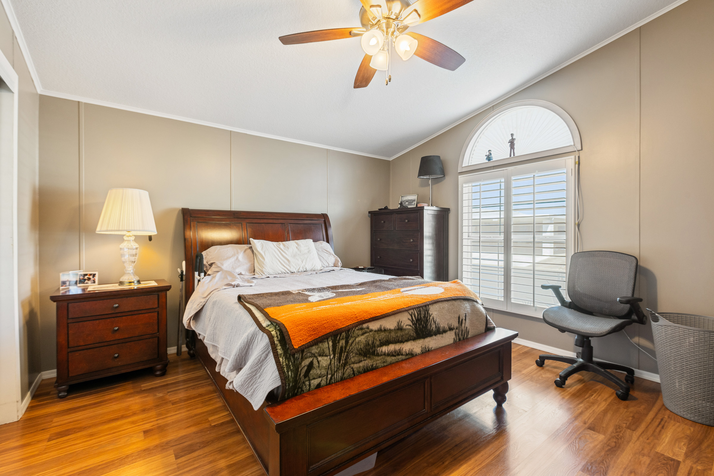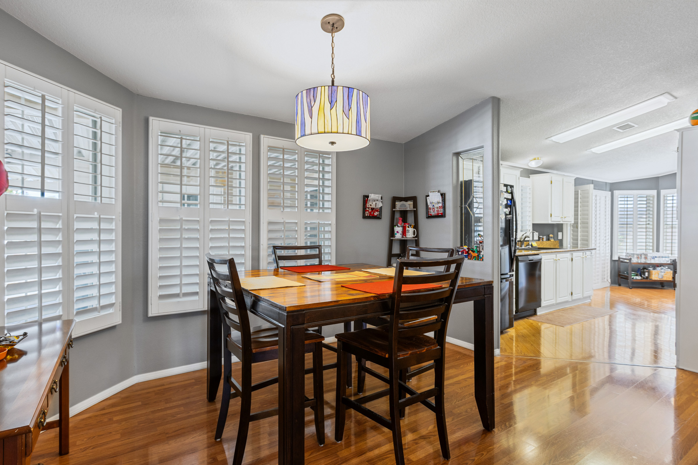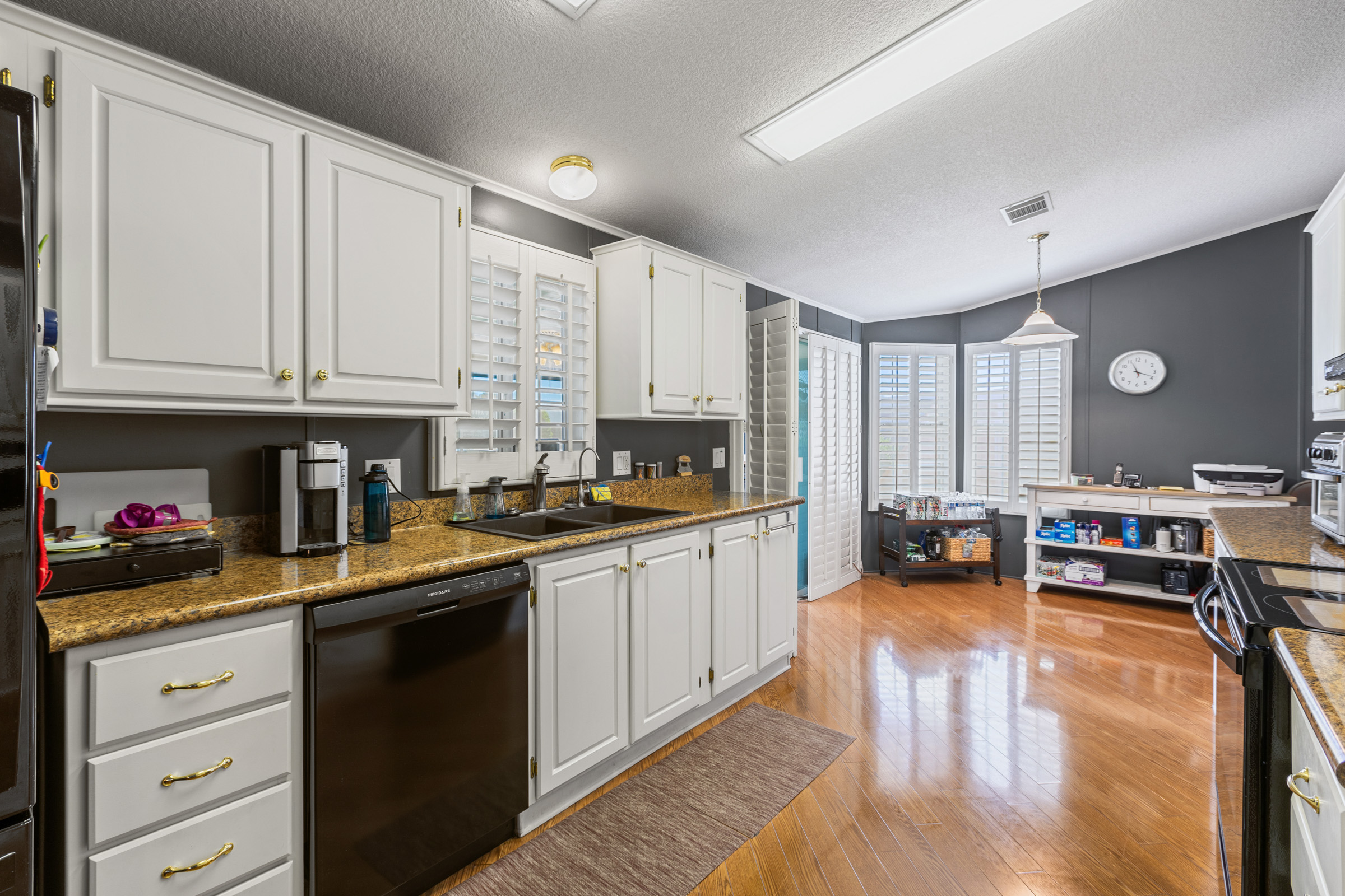 Spacious 2BD/2BA home with a den and highly desirable split floor plan. Plantation shutters, beautiful flooring, and freshly painted rooms in chic tones create a modern feel. The kitchen features sleek black appliances, while the spacious primary suite accommodates a king-size set. Additional highlights include indoor laundry, updated easy access showers, a glassed-in Arizona room with blackout shades, and a large outdoor space with a partially covered patio, perfect for relaxing or entertaining.