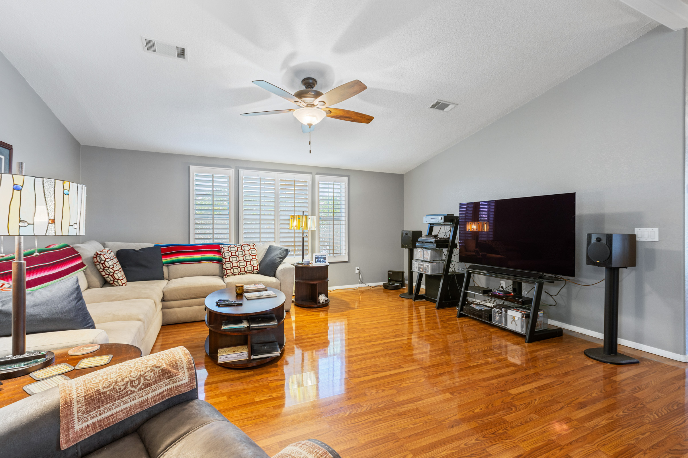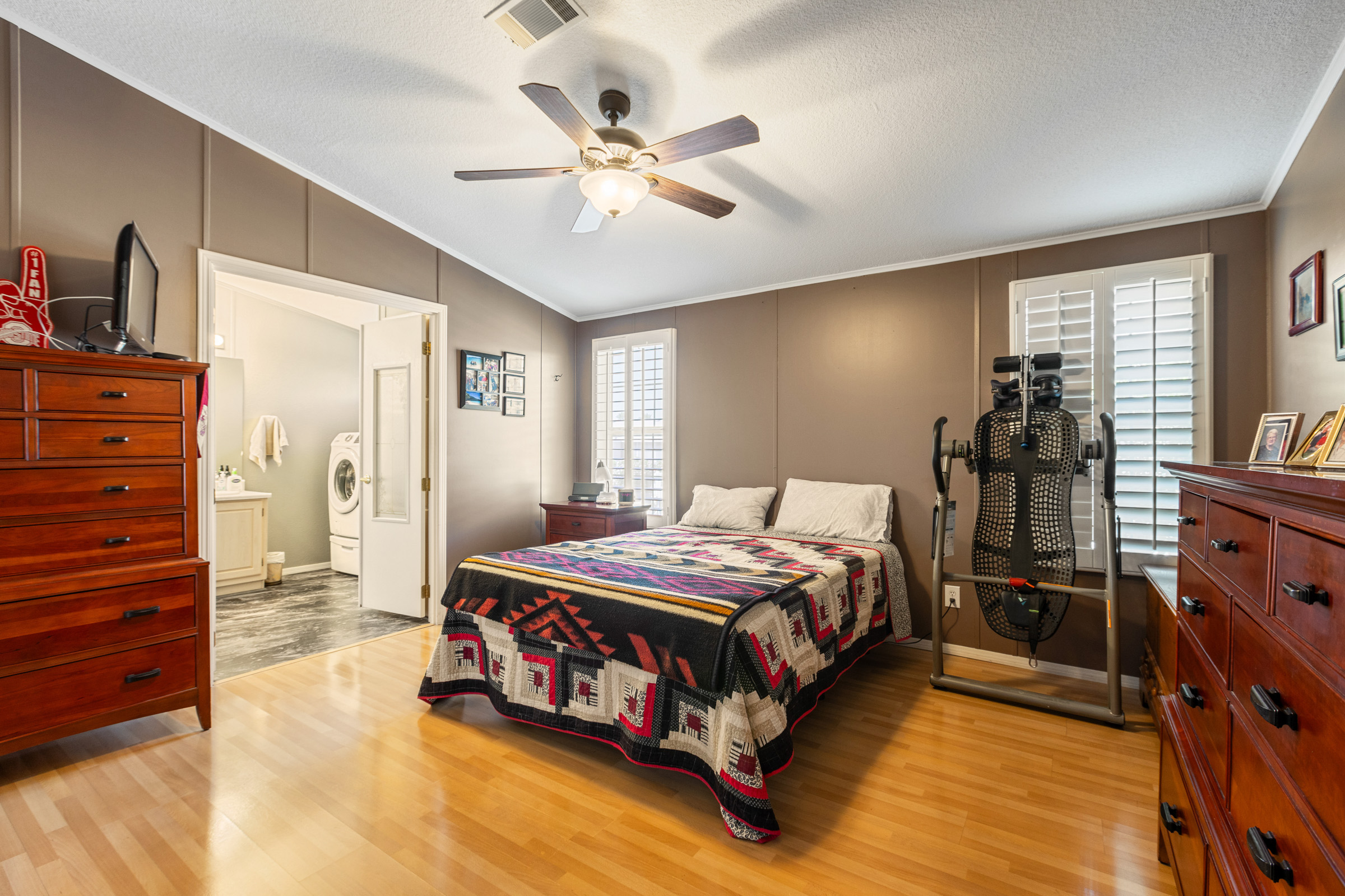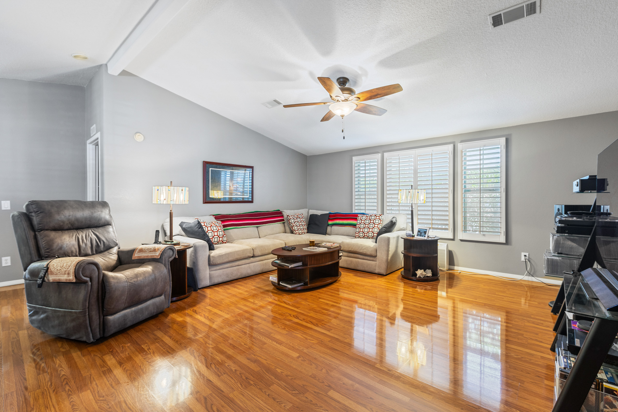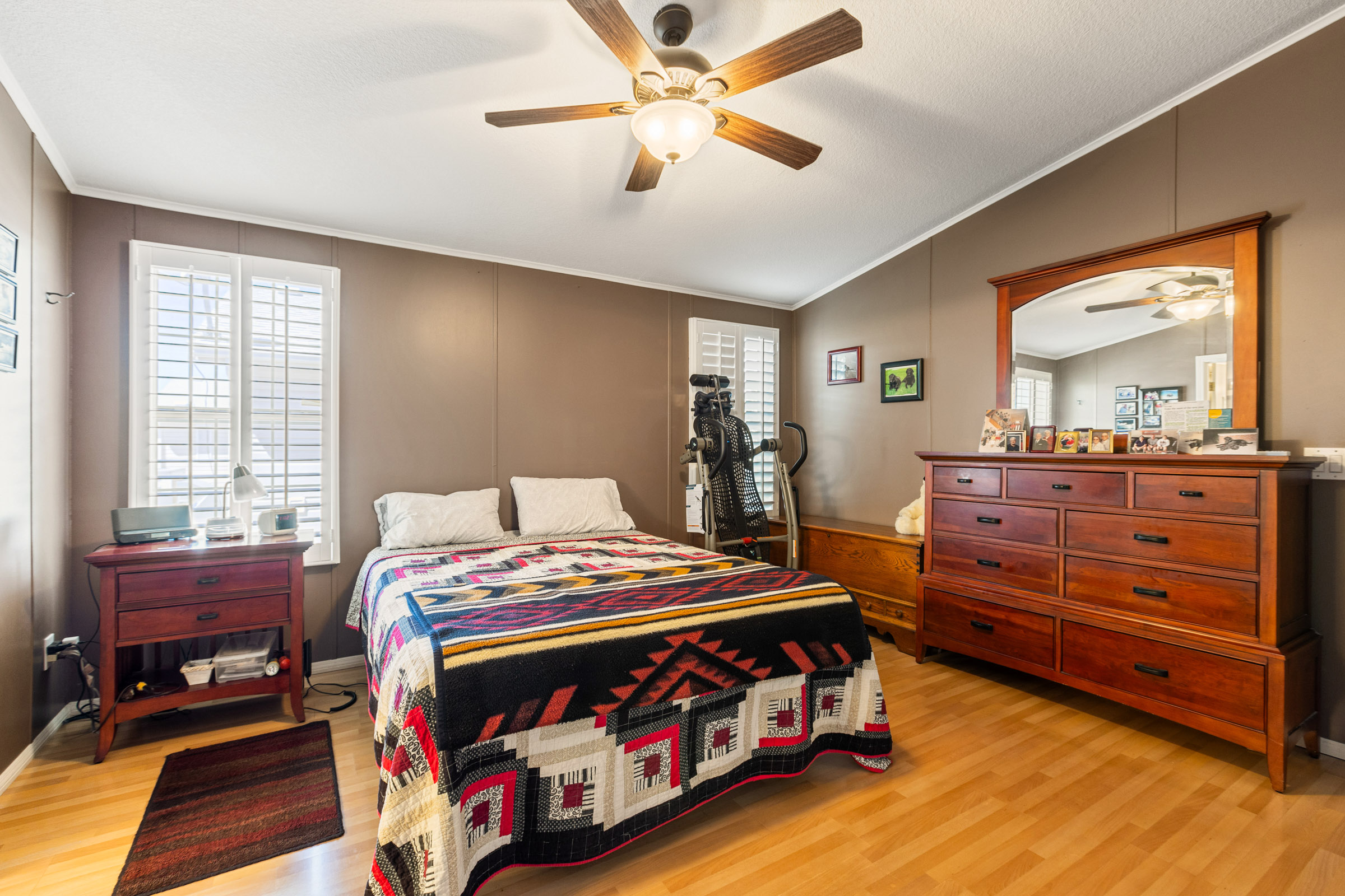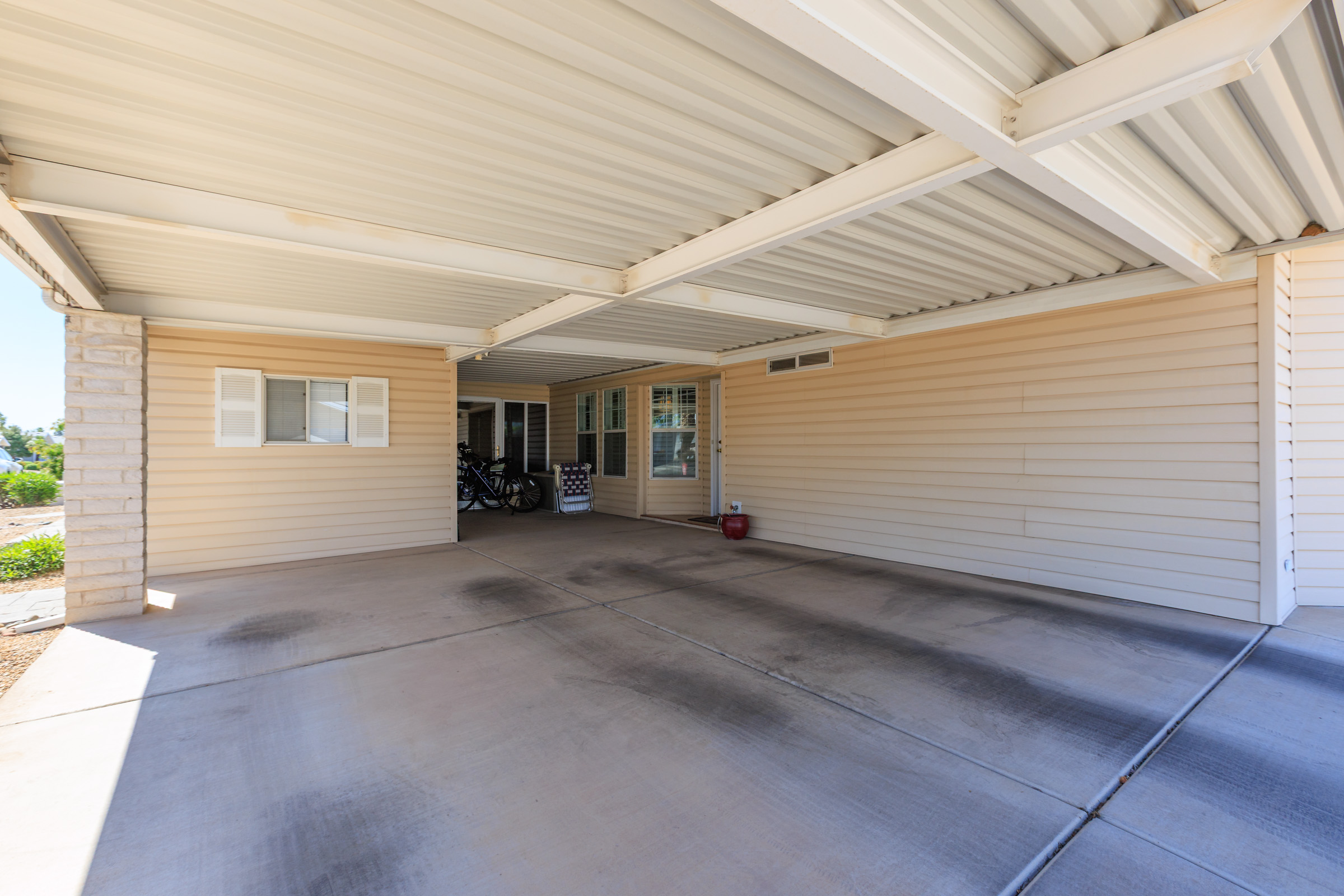 Spacious 2BD/2BA home with a den and highly desirable split floor plan. Plantation shutters, beautiful flooring, and freshly painted rooms in chic tones create a modern feel. The kitchen features sleek black appliances, while the spacious primary suite accommodates a king-size set. Additional highlights include indoor laundry, updated easy access showers, a glassed-in Arizona room with blackout shades, and a large outdoor space with a partially covered patio, perfect for relaxing or entertaining.
