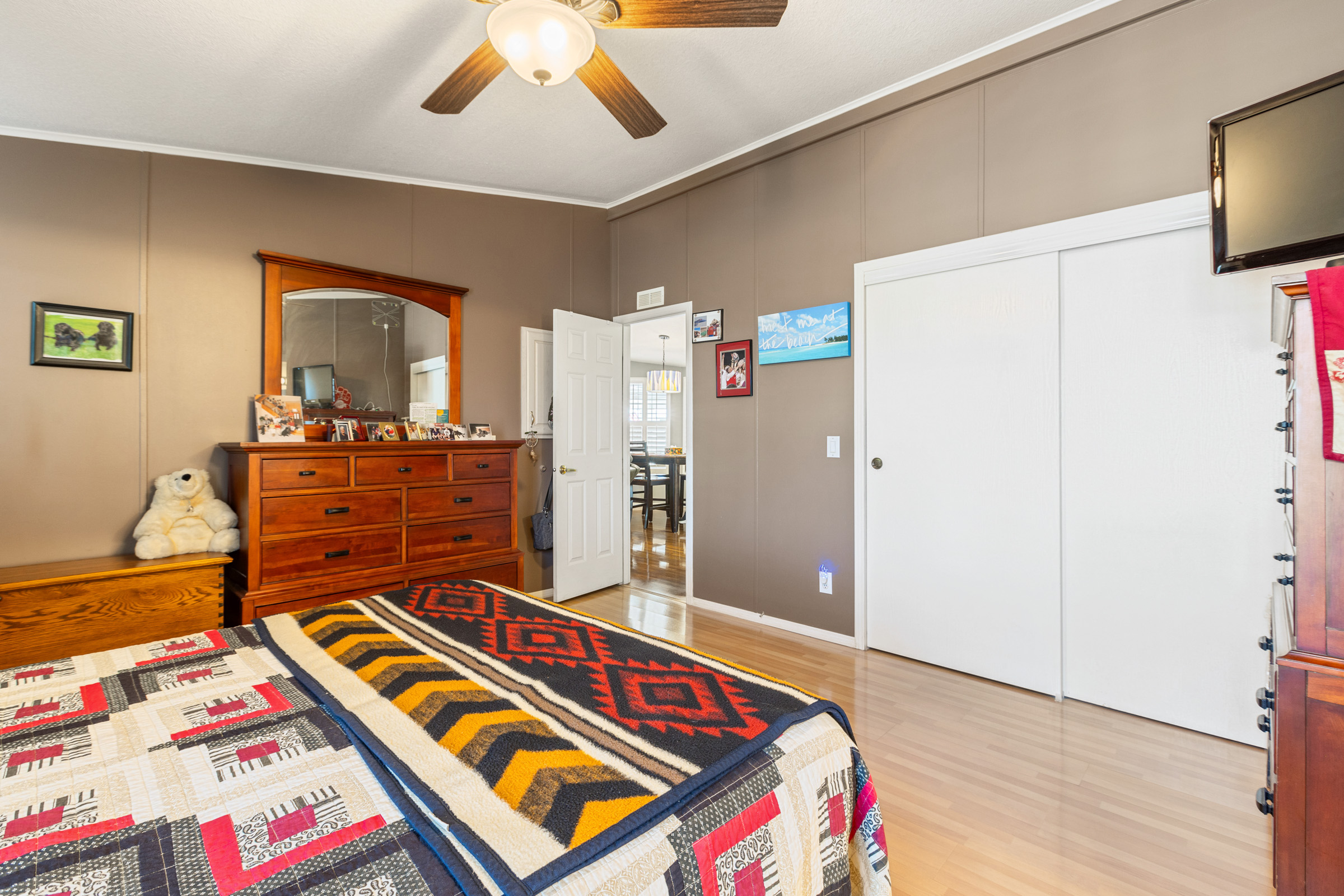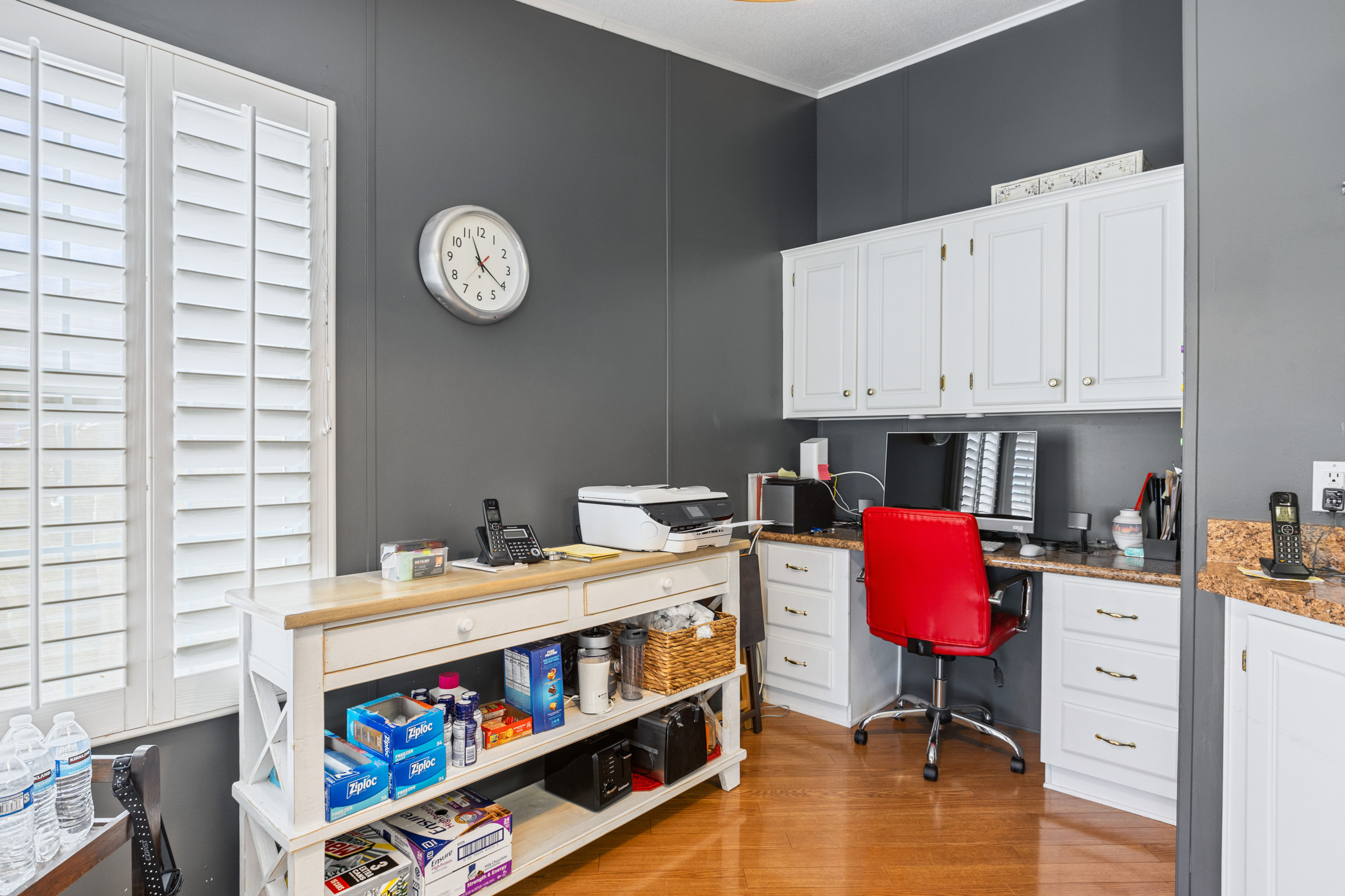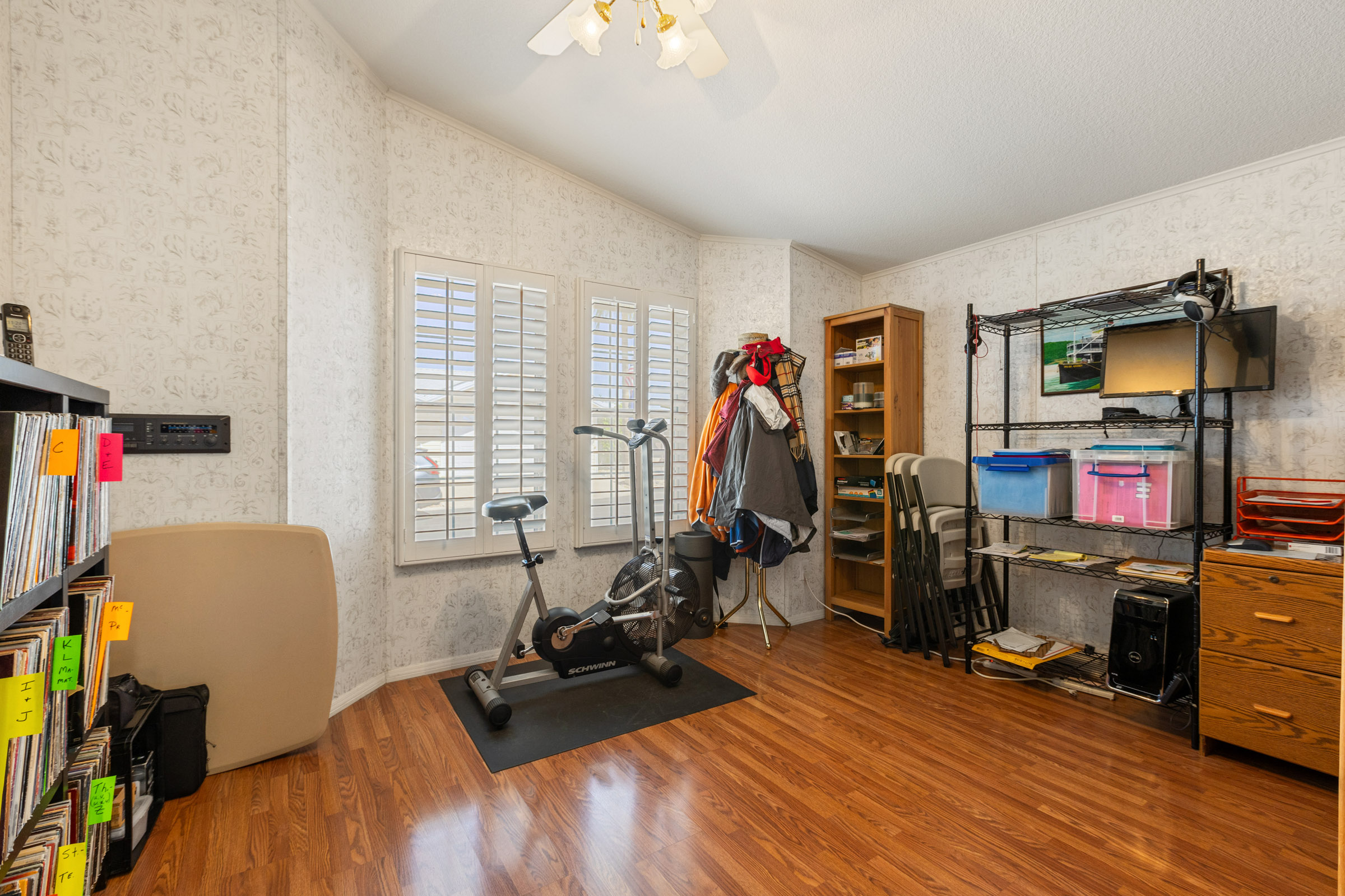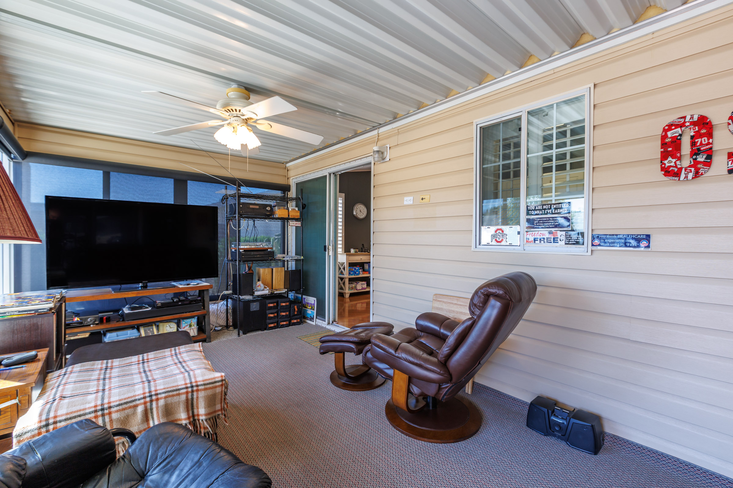 Spacious 2BD/2BA home with a den and highly desirable split floor plan. Plantation shutters, beautiful flooring, and freshly painted rooms in chic tones create a modern feel. The kitchen features sleek black appliances, while the spacious primary suite accommodates a king-size set. Additional highlights include indoor laundry, updated easy access showers, a glassed-in Arizona room with blackout shades, and a large outdoor space with a partially covered patio, perfect for relaxing or entertaining.