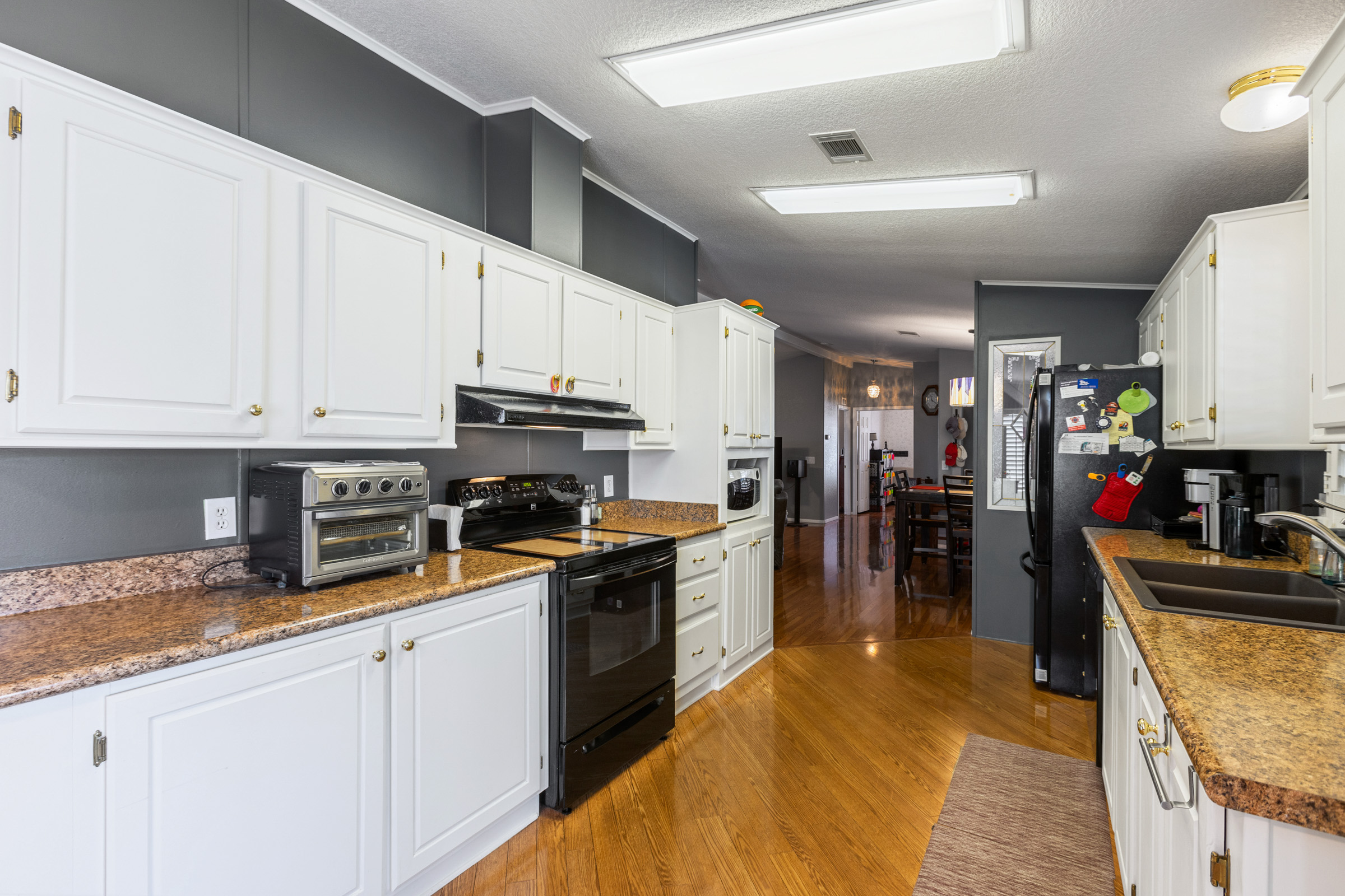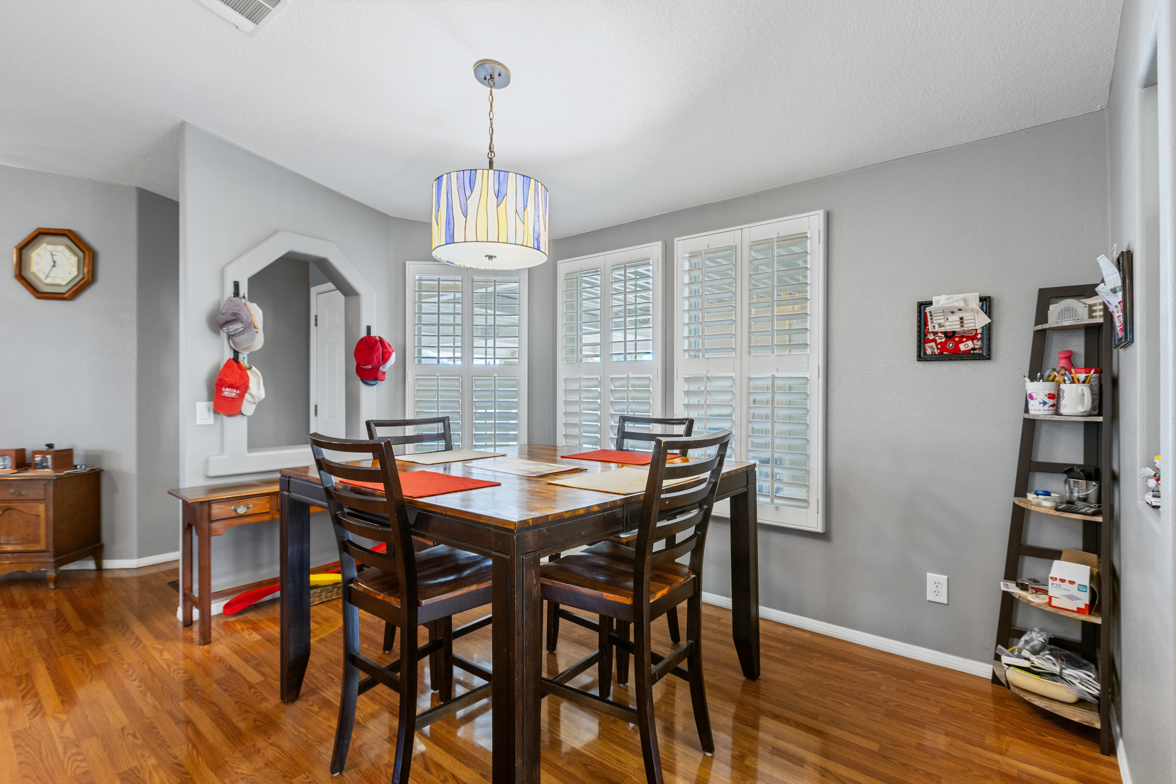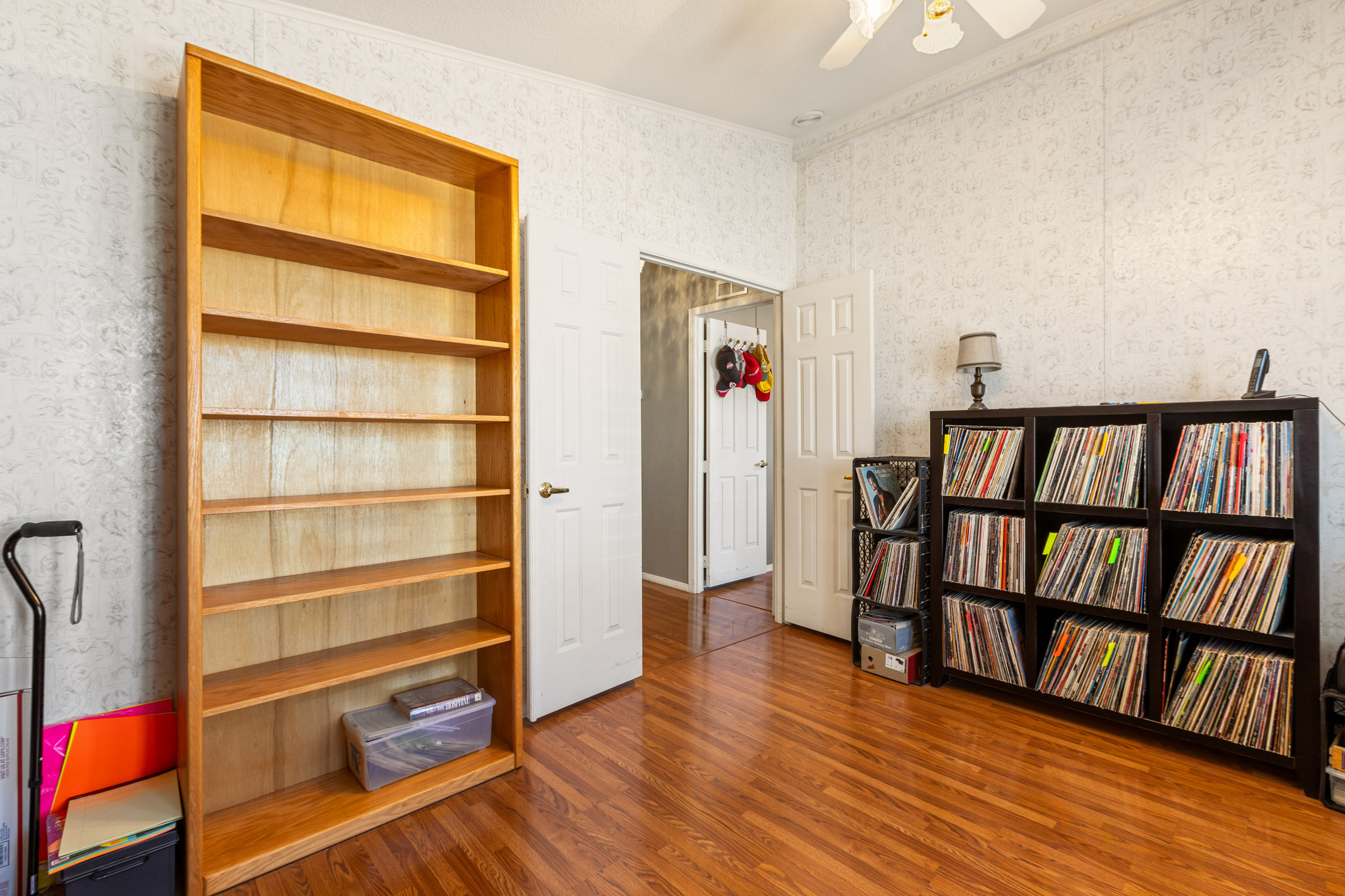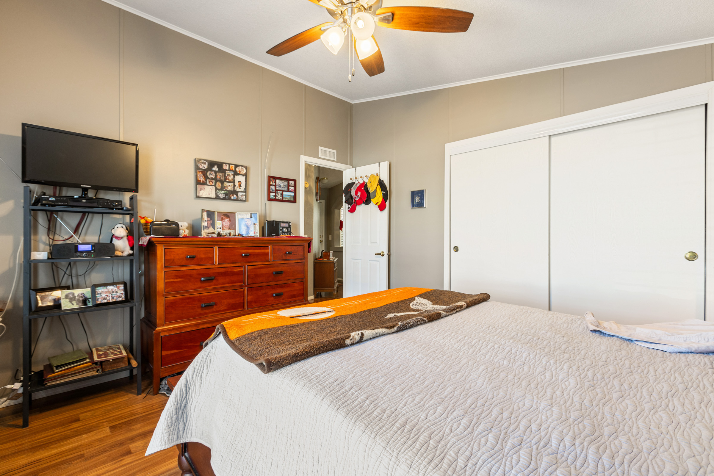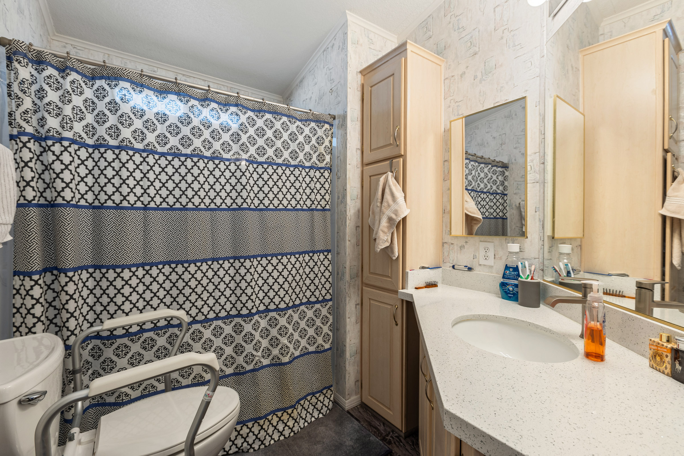Spacious 2BD/2BA home with a den and highly desirable split floor plan. Plantation shutters, beautiful flooring, and freshly painted rooms in chic tones create a modern feel. The kitchen features sleek black appliances, while the spacious primary suite accommodates a king-size set. Additional highlights include indoor laundry, updated easy access showers, a glassed-in Arizona room with blackout shades, and a large outdoor space with a partially covered patio, perfect for relaxing or entertaining.