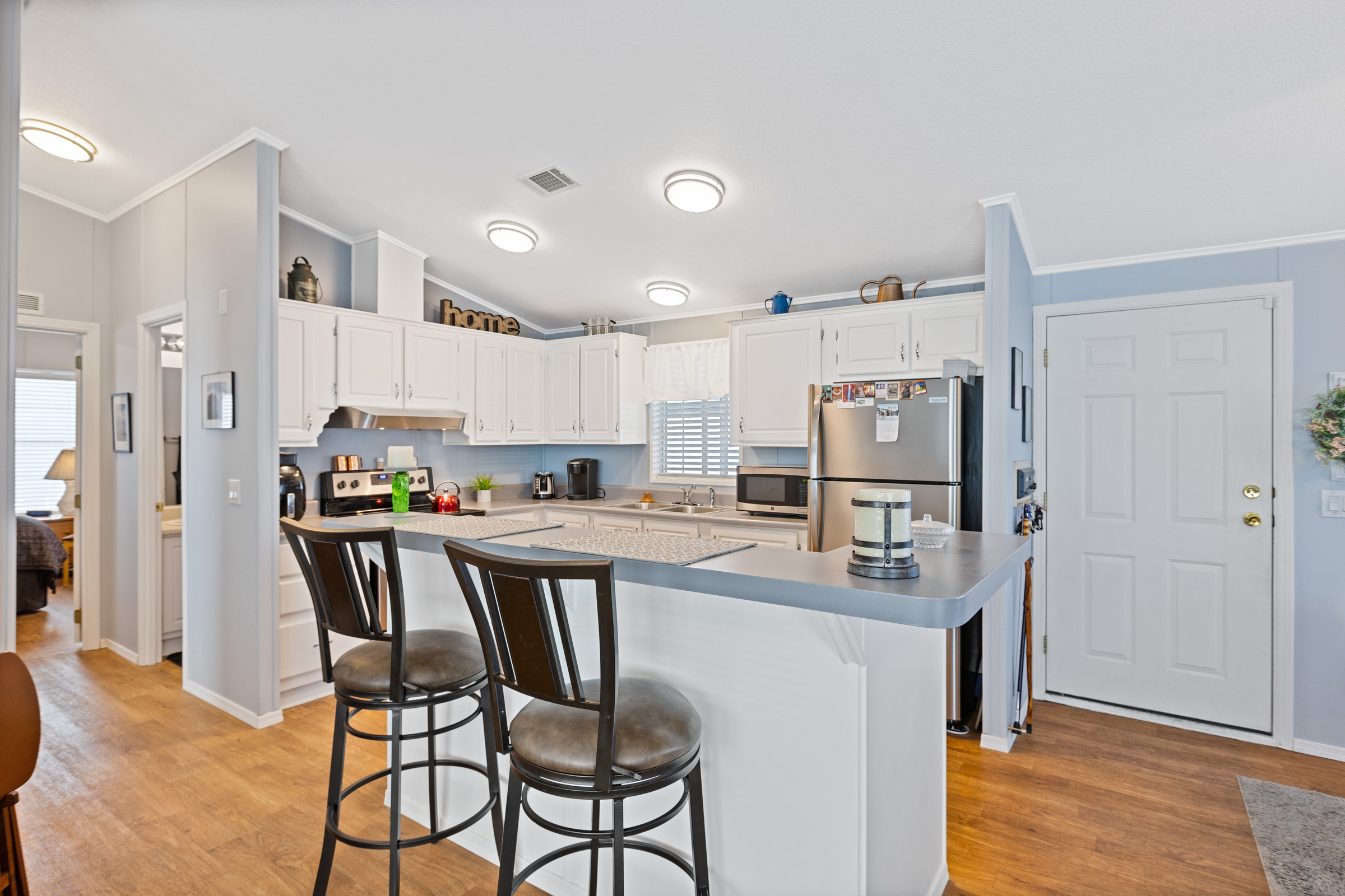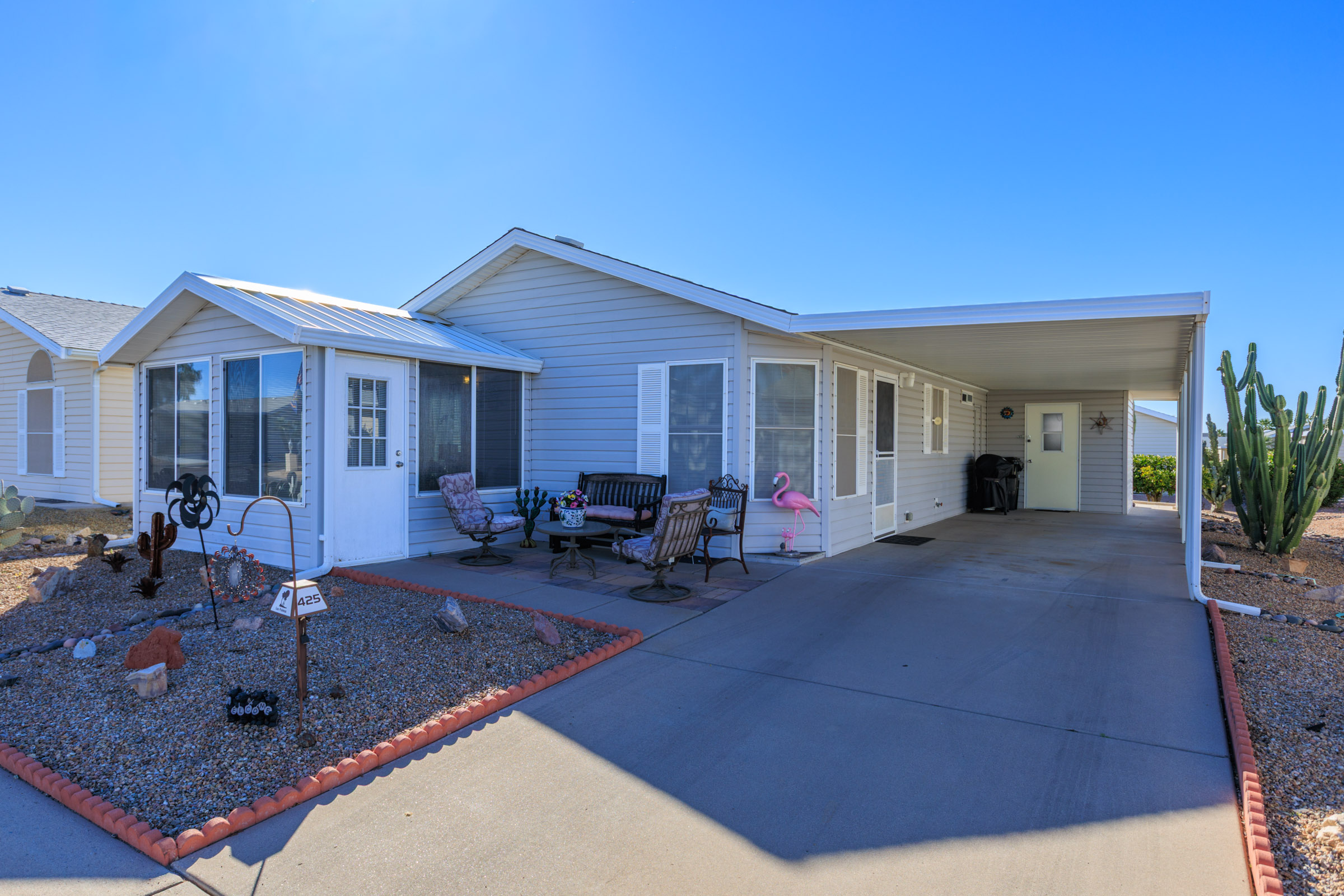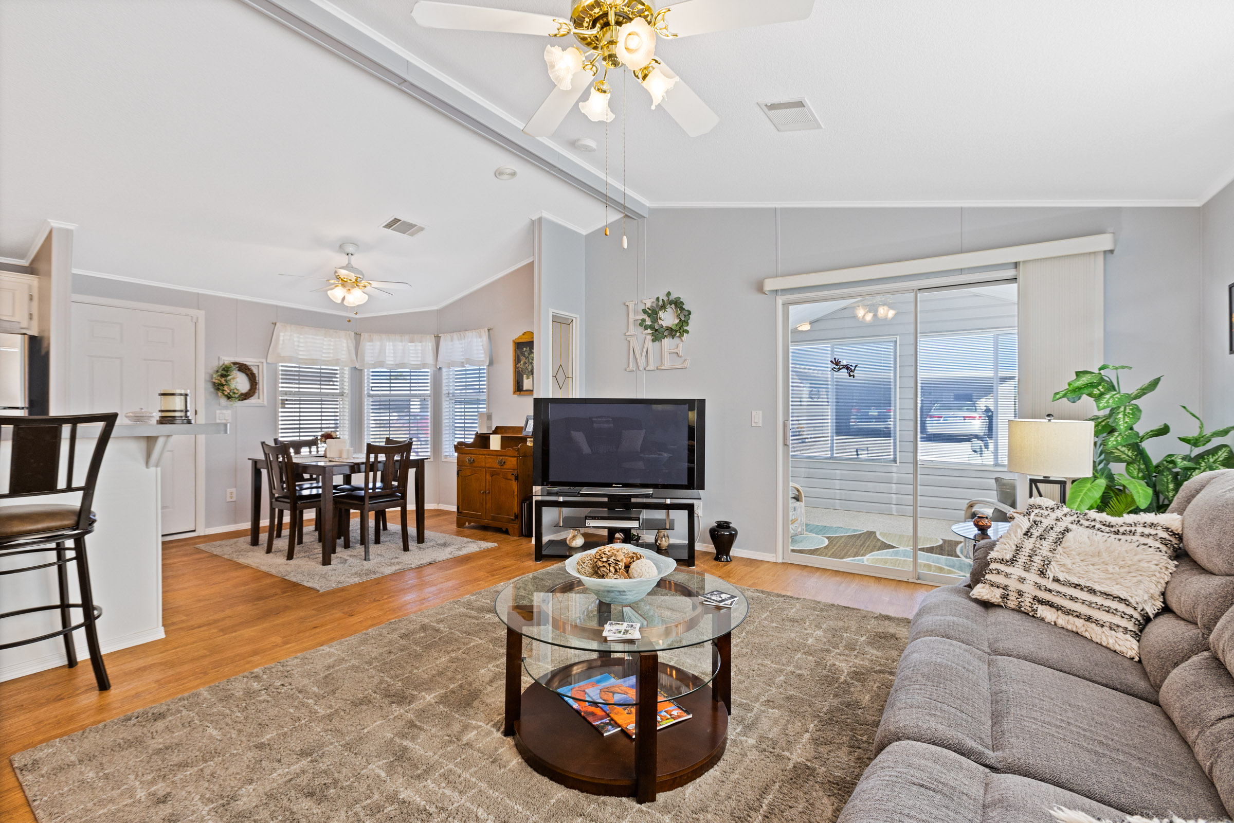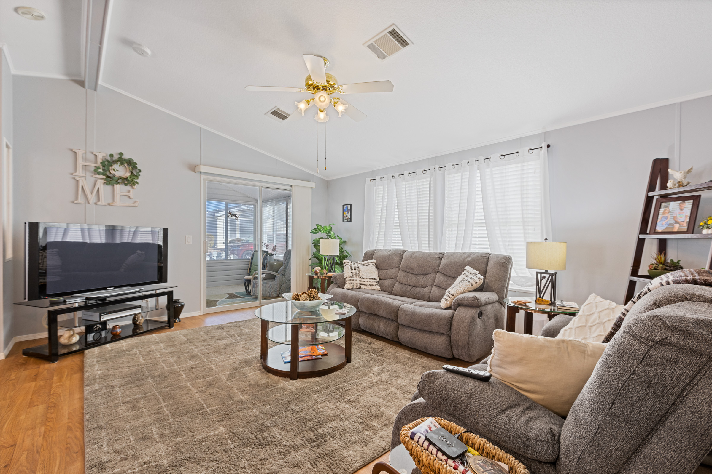 This tastefully furnished 2-bedroom, 2-bath open-concept home features soaring cathedral ceilings and zero carpet throughout for a clean, modern feel. The spacious kitchen offers an eat-in island/bar and sleek stainless-steel appliances. Both bedrooms include walk-in closets, while the primary suite boasts a uniquely placed back door leading directly to the private back patio. Enjoy relaxing on front and rear patios, plus a beautifully glass-enclosed AZ room completes this lovely home.