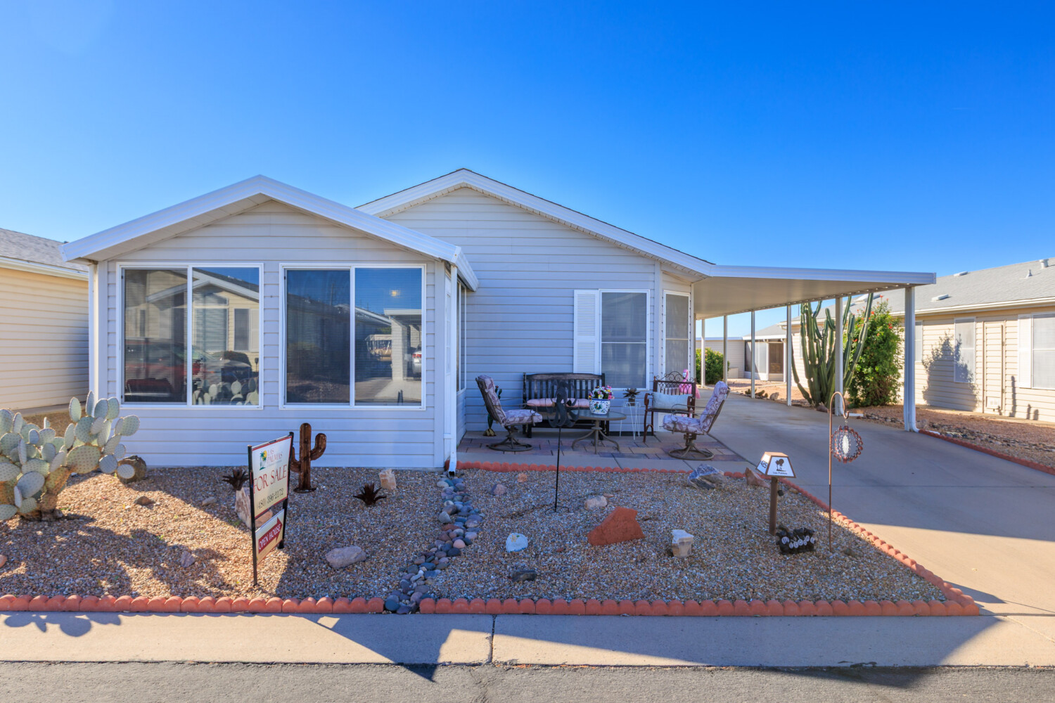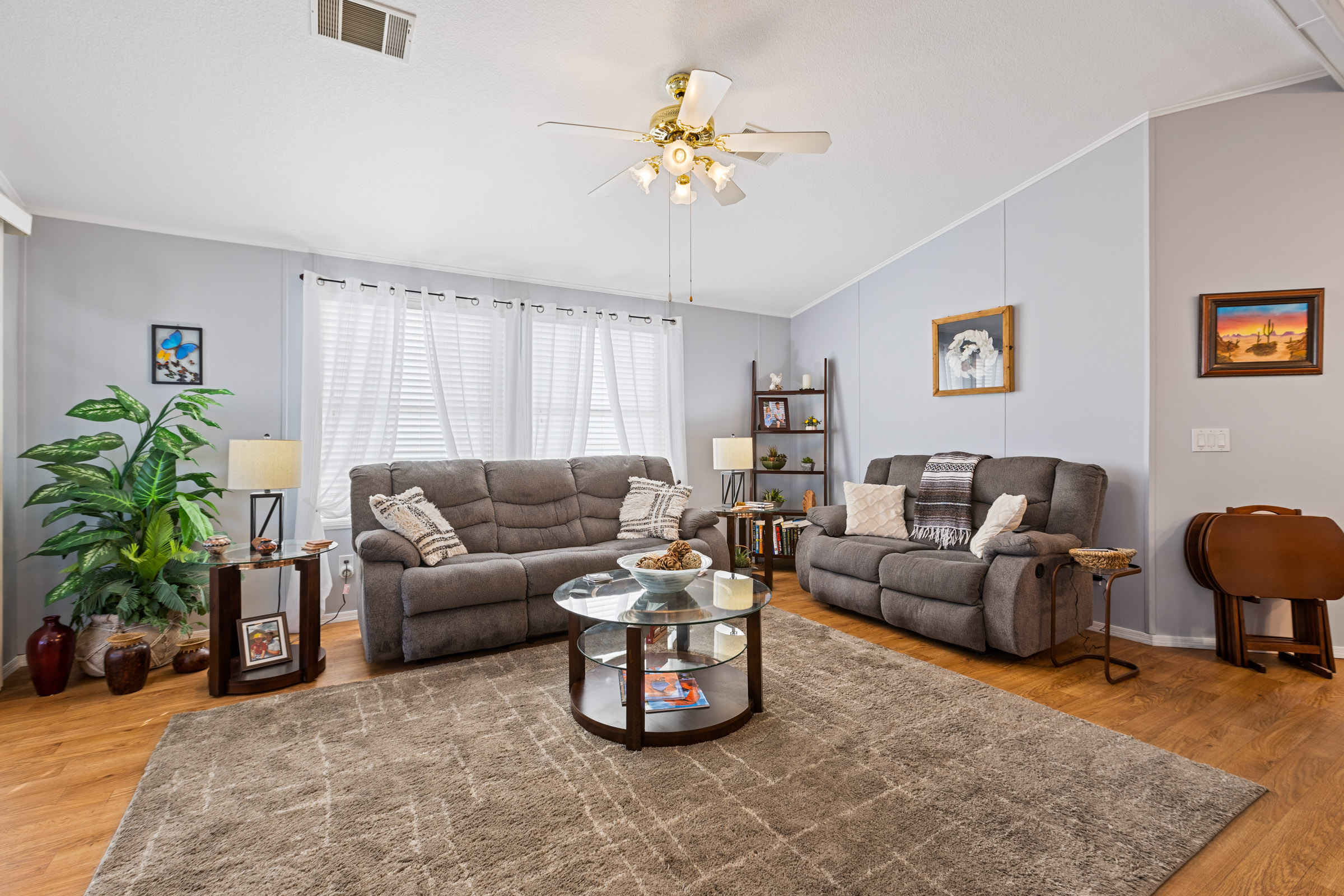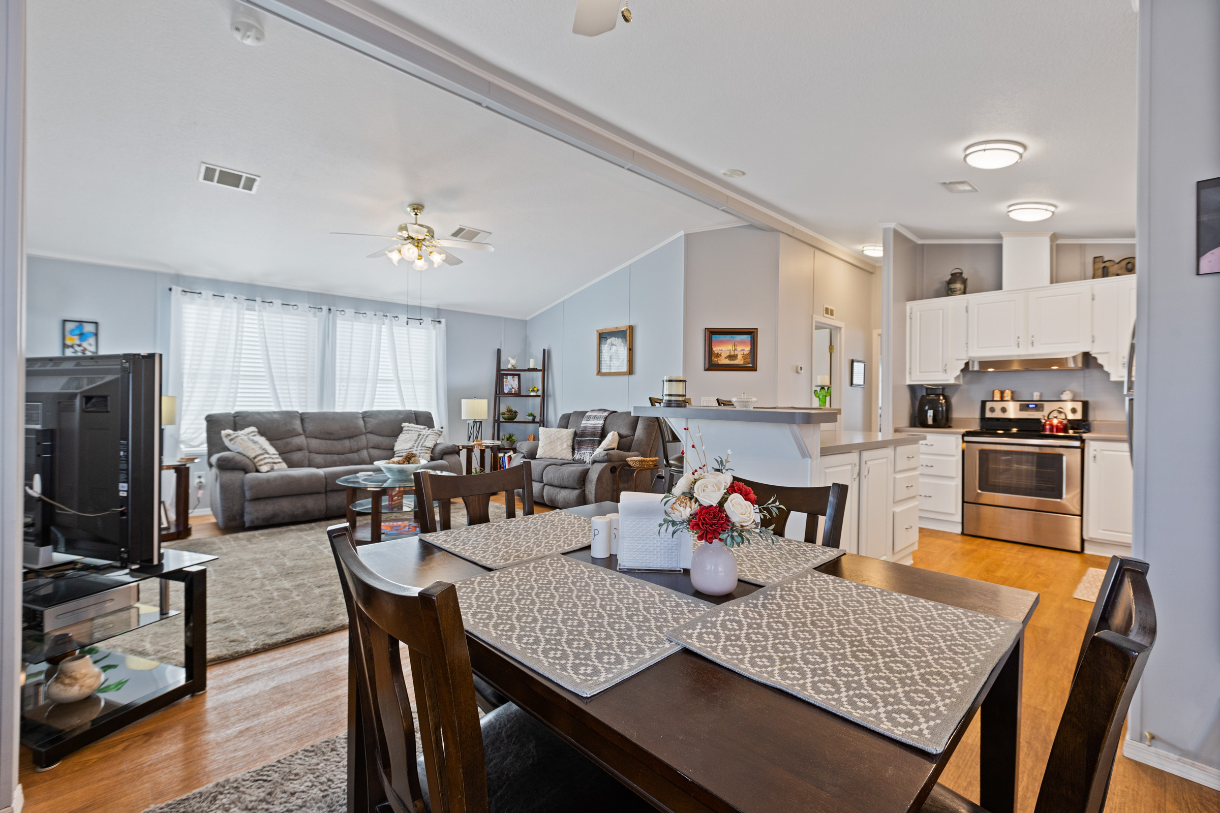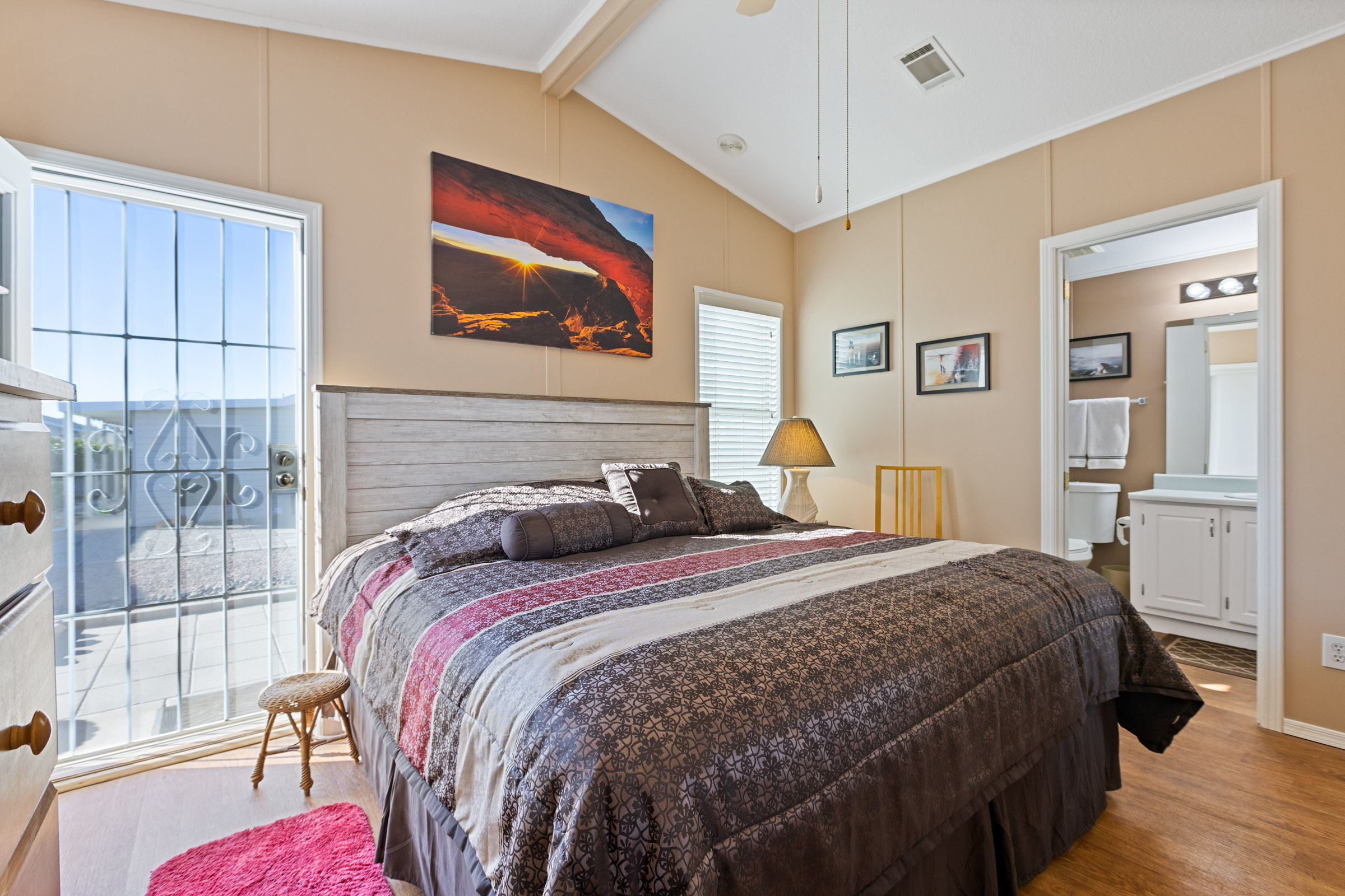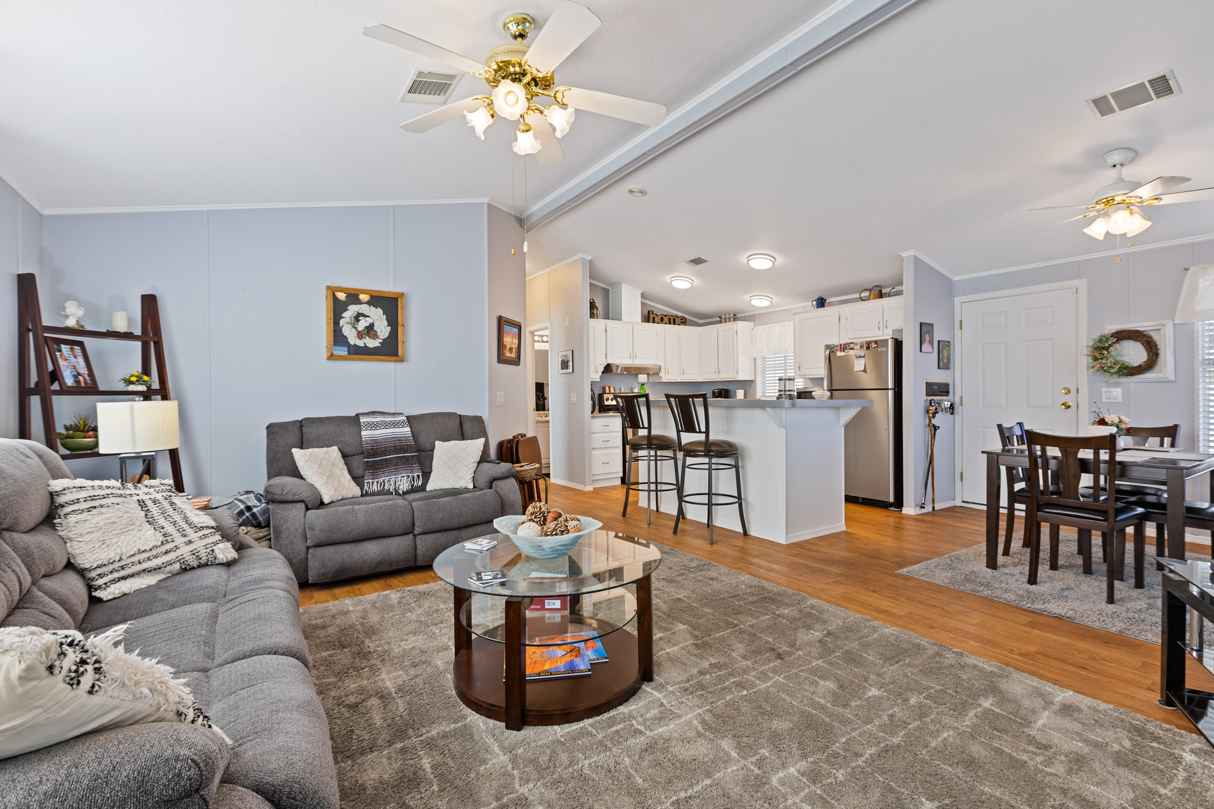 This tastefully furnished 2-bedroom, 2-bath open-concept home features soaring cathedral ceilings and zero carpet throughout for a clean, modern feel. The spacious kitchen offers an eat-in island/bar and sleek stainless-steel appliances. Both bedrooms include walk-in closets, while the primary suite boasts a uniquely placed back door leading directly to the private back patio. Enjoy relaxing on front and rear patios, plus a beautifully glass-enclosed AZ room completes this lovely home.