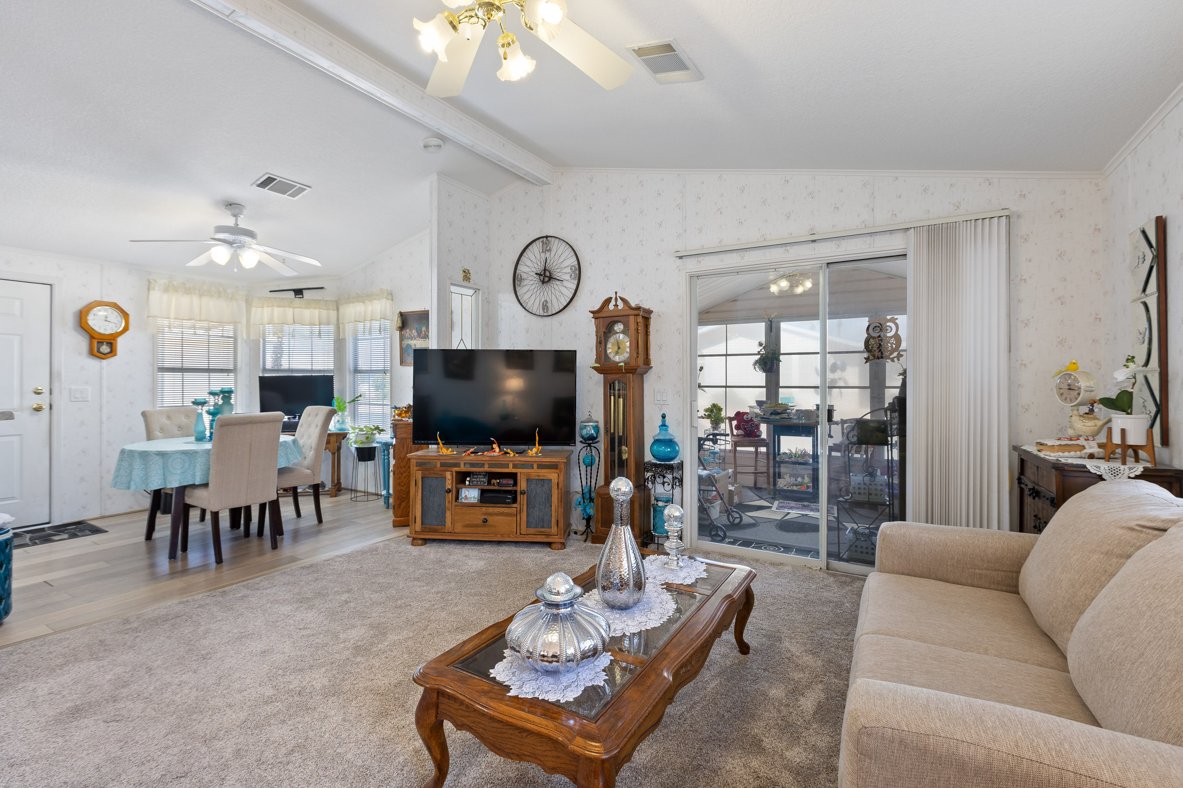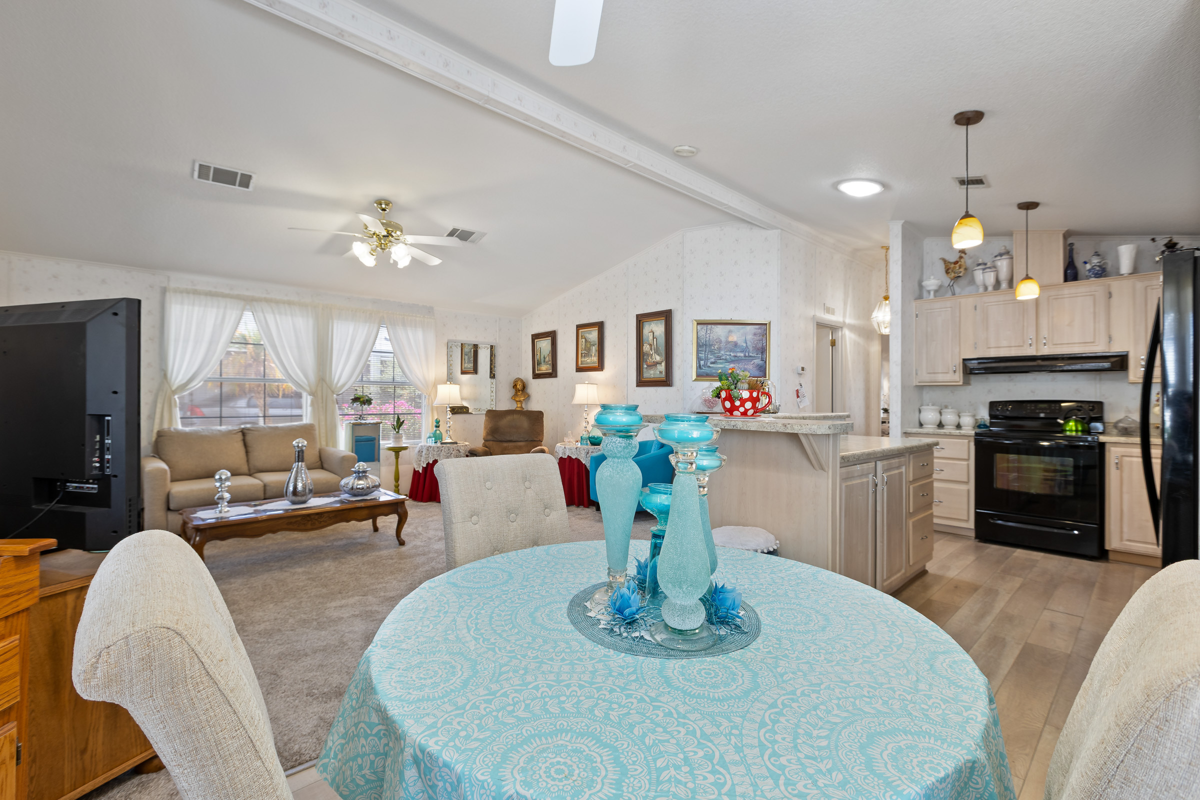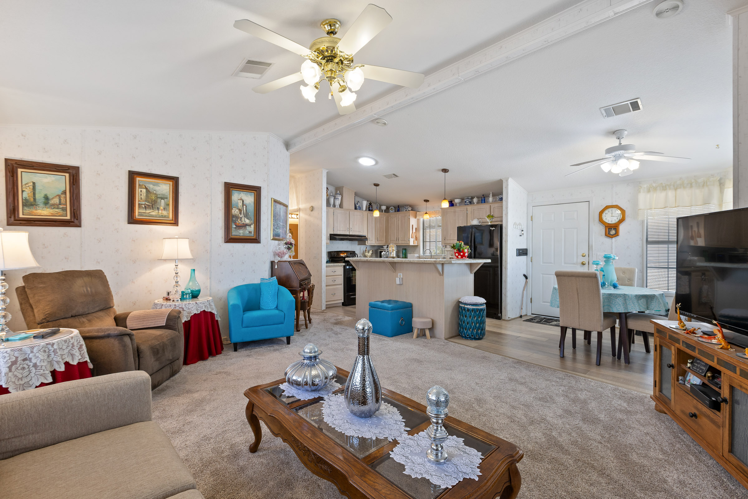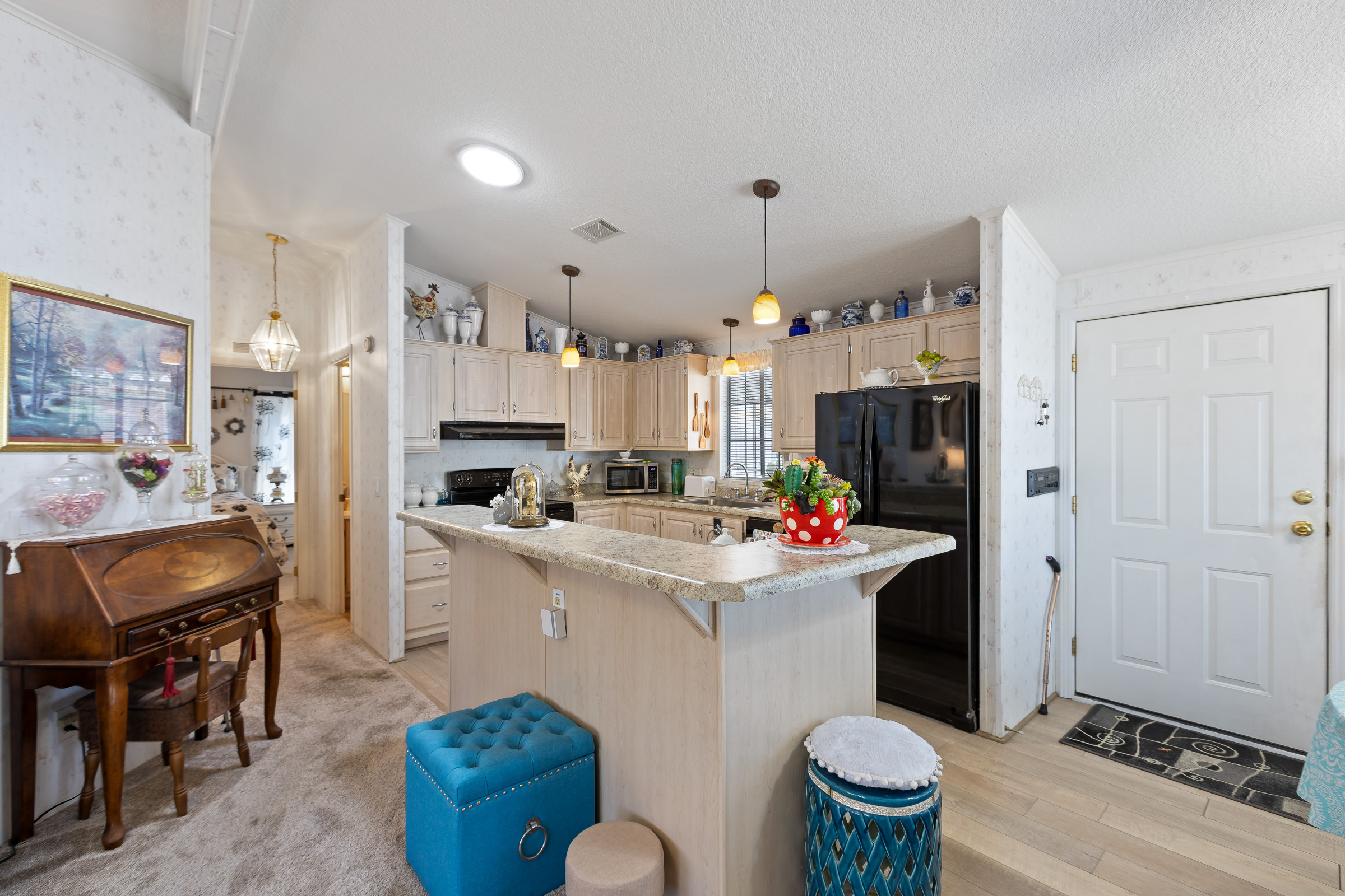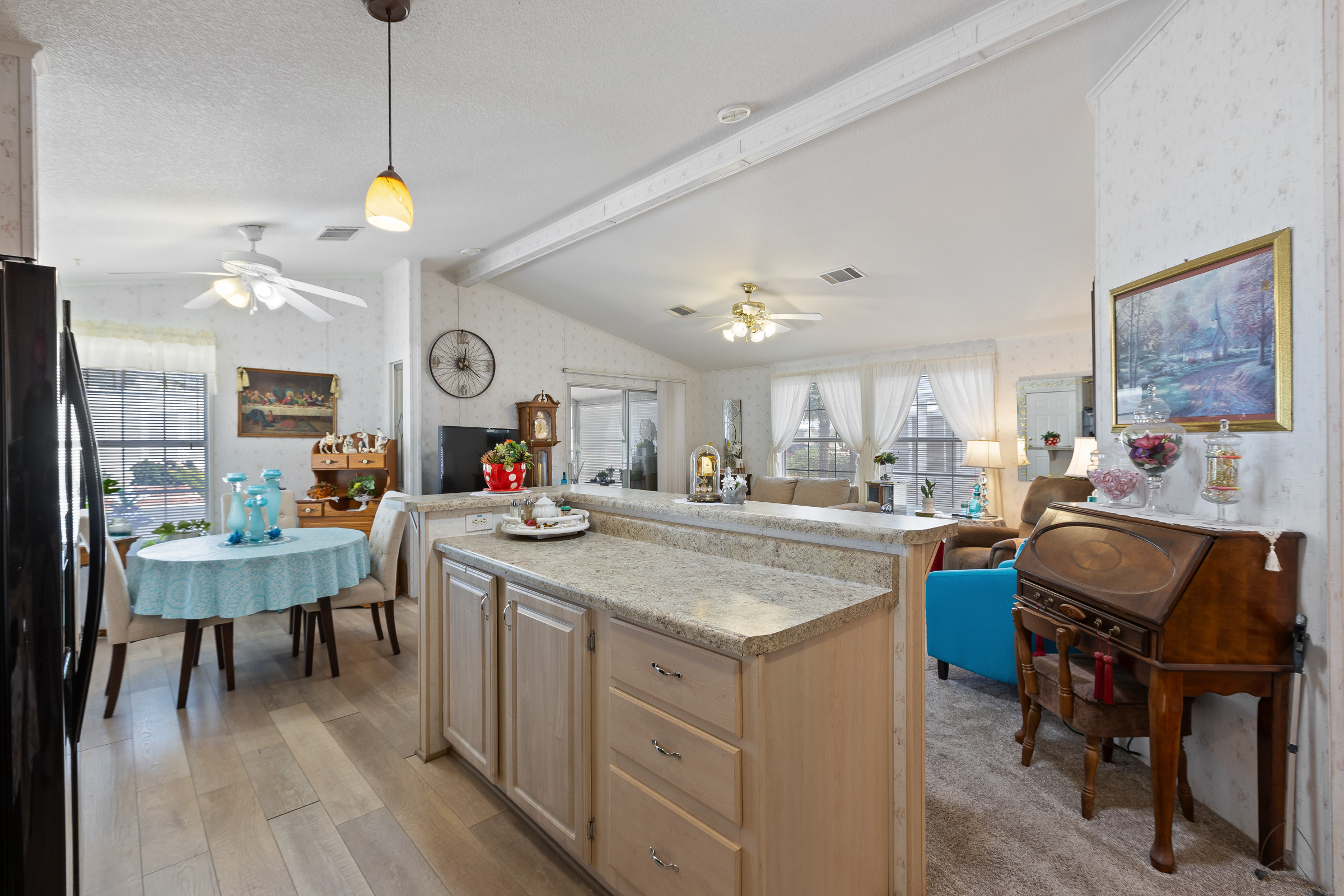 Charming 2BD/2BA open-concept home with cathedral ceilings and abundant natural light. Bay windows grace the dining area, while a raised breakfast bar offers the perfect spot for morning coffee. The bright living space flows into a spacious Arizona room for added comfort. Both bedrooms feature walk-in closets, and the primary suite includes an en suite bath with a walk-in shower and full-size linen closet. A well-designed layout makes this home both functional and inviting.