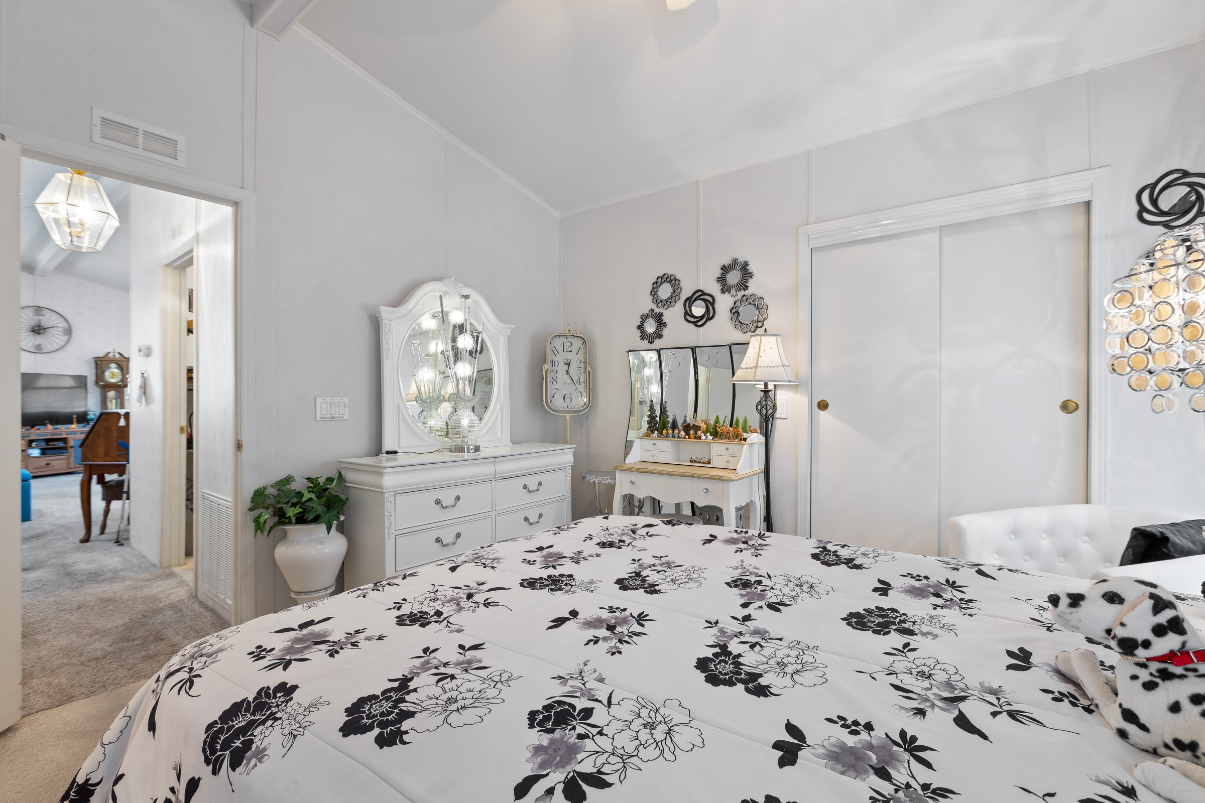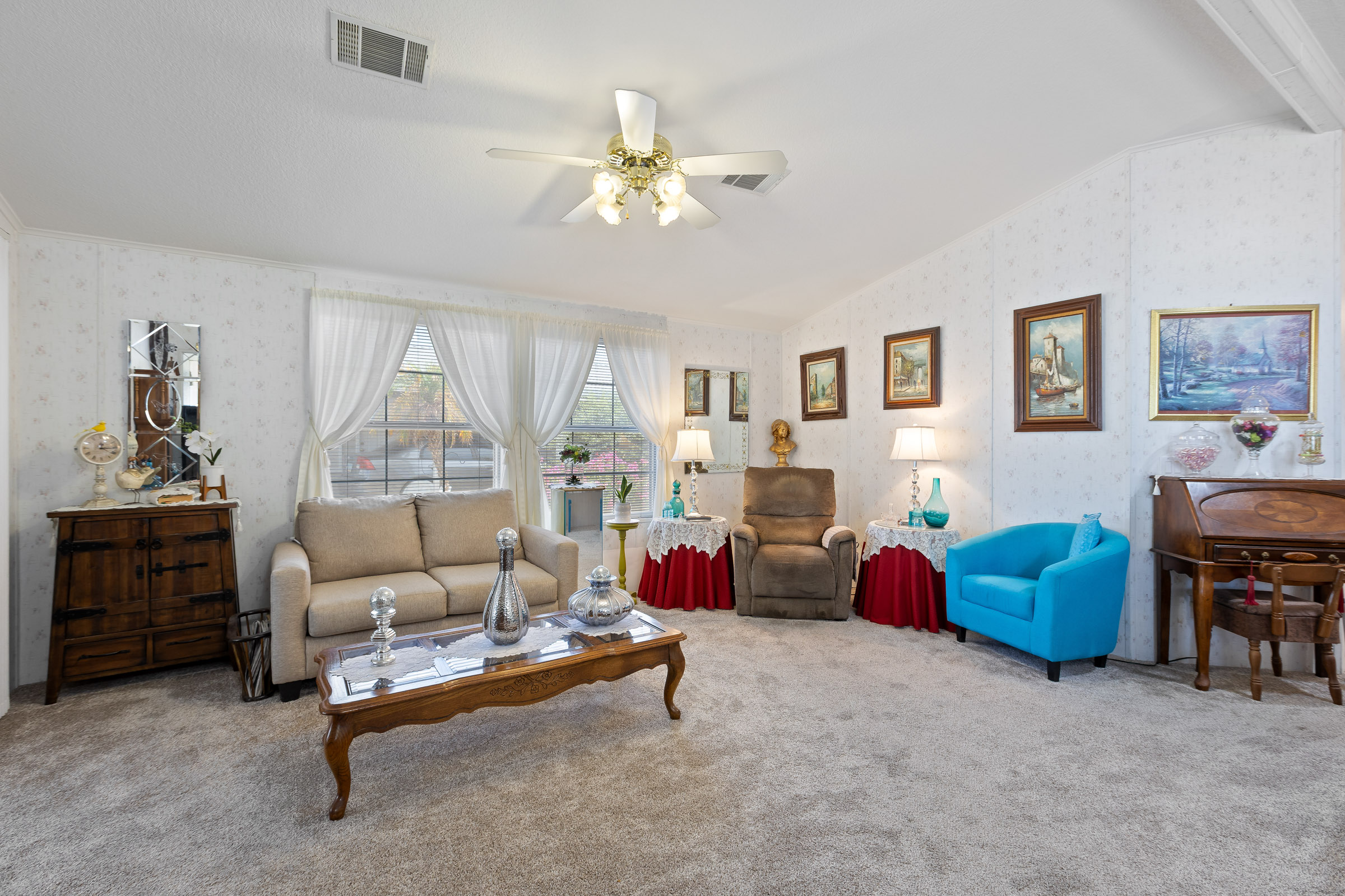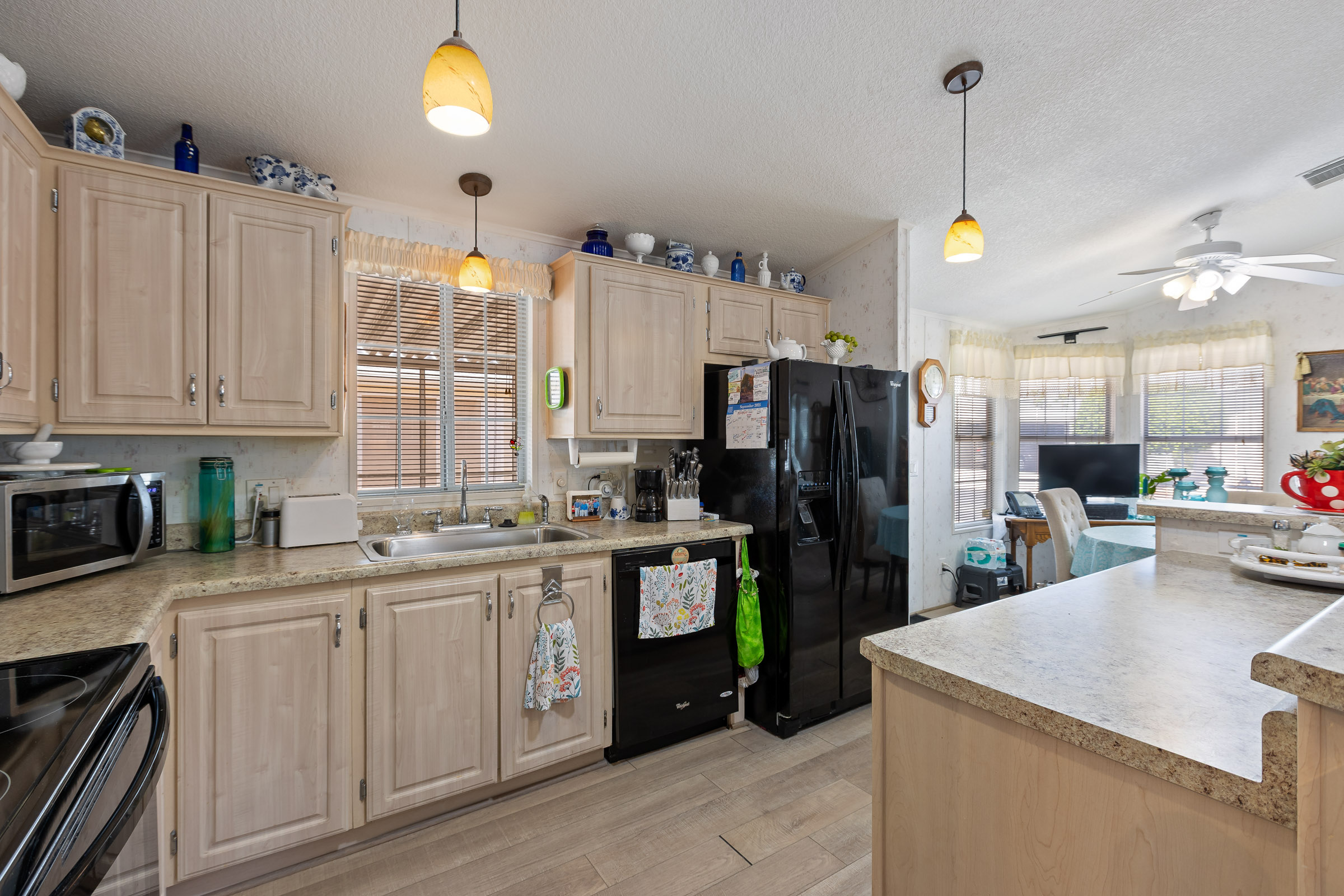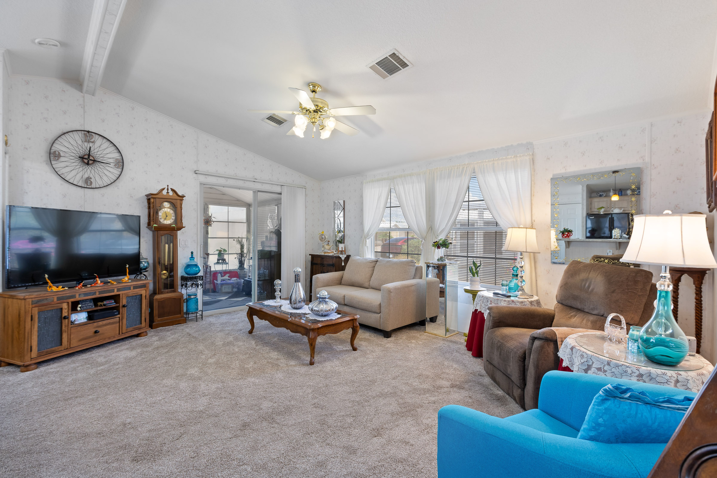 Charming 2BD/2BA open-concept home with cathedral ceilings and abundant natural light. Bay windows grace the dining area, while a raised breakfast bar offers the perfect spot for morning coffee. The bright living space flows into a spacious Arizona room for added comfort. Both bedrooms feature walk-in closets, and the primary suite includes an en suite bath with a walk-in shower and full-size linen closet. A well-designed layout makes this home both functional and inviting.