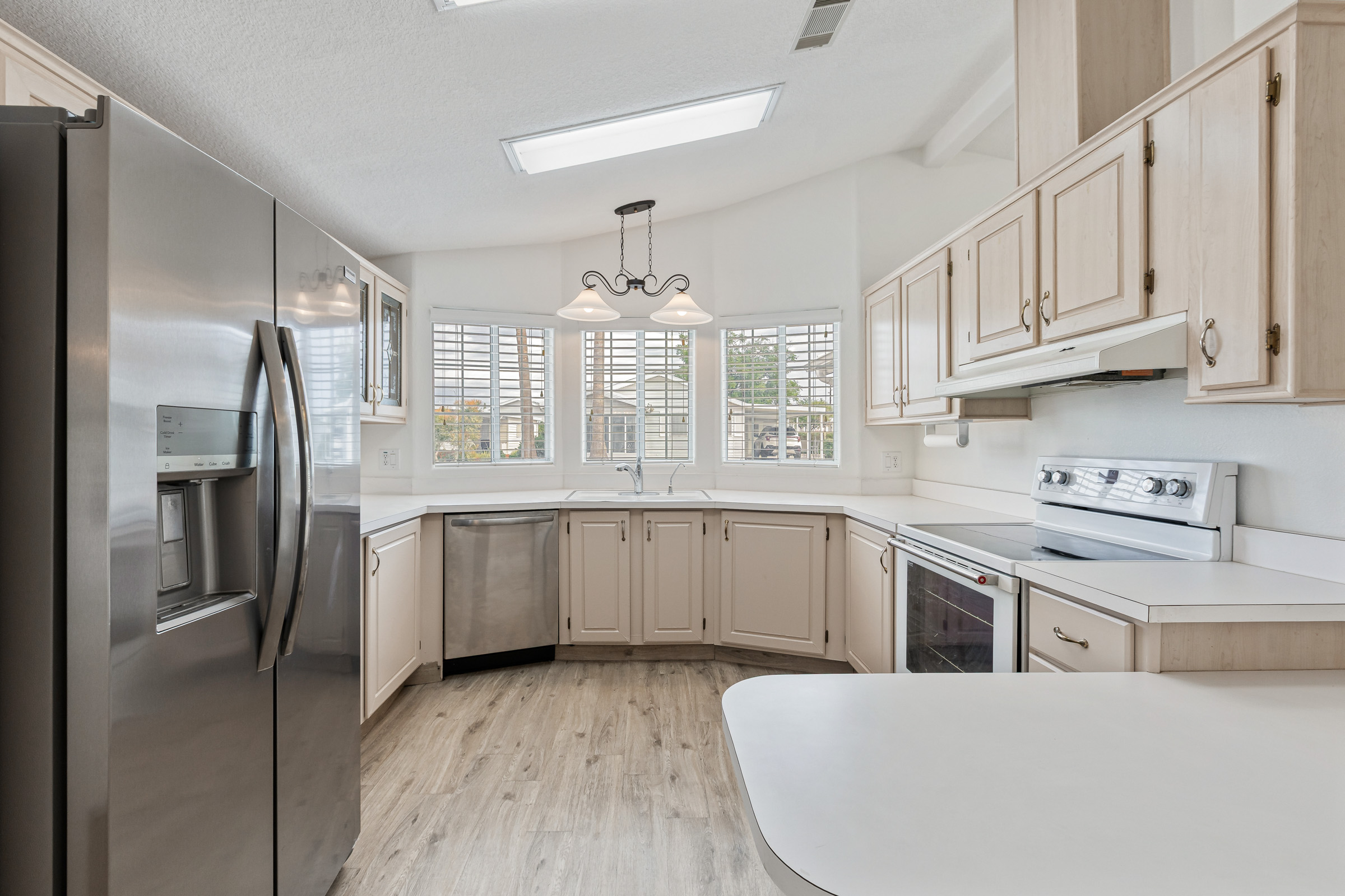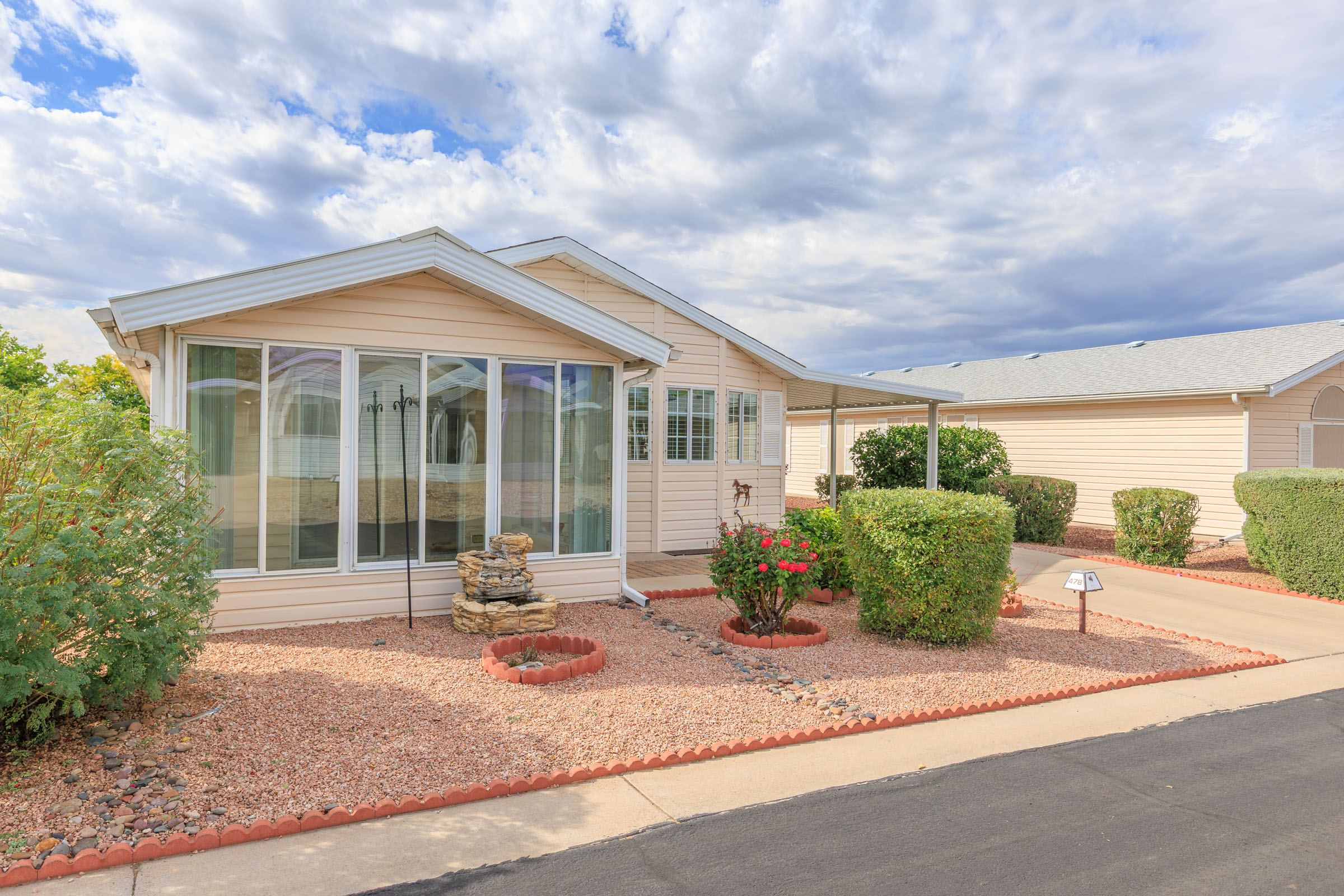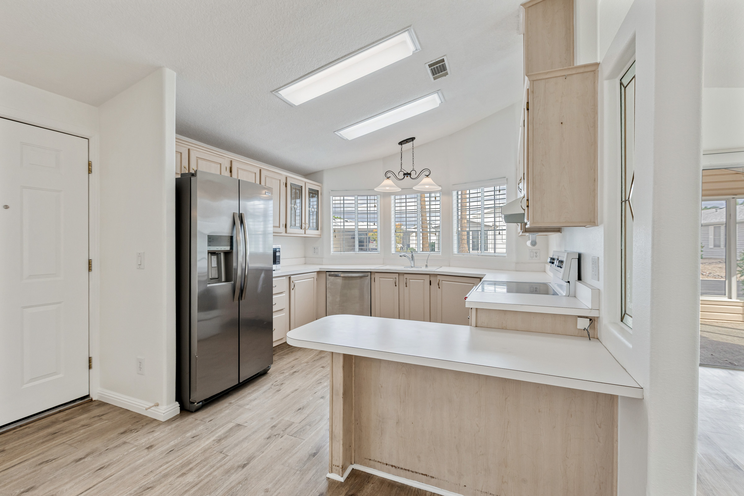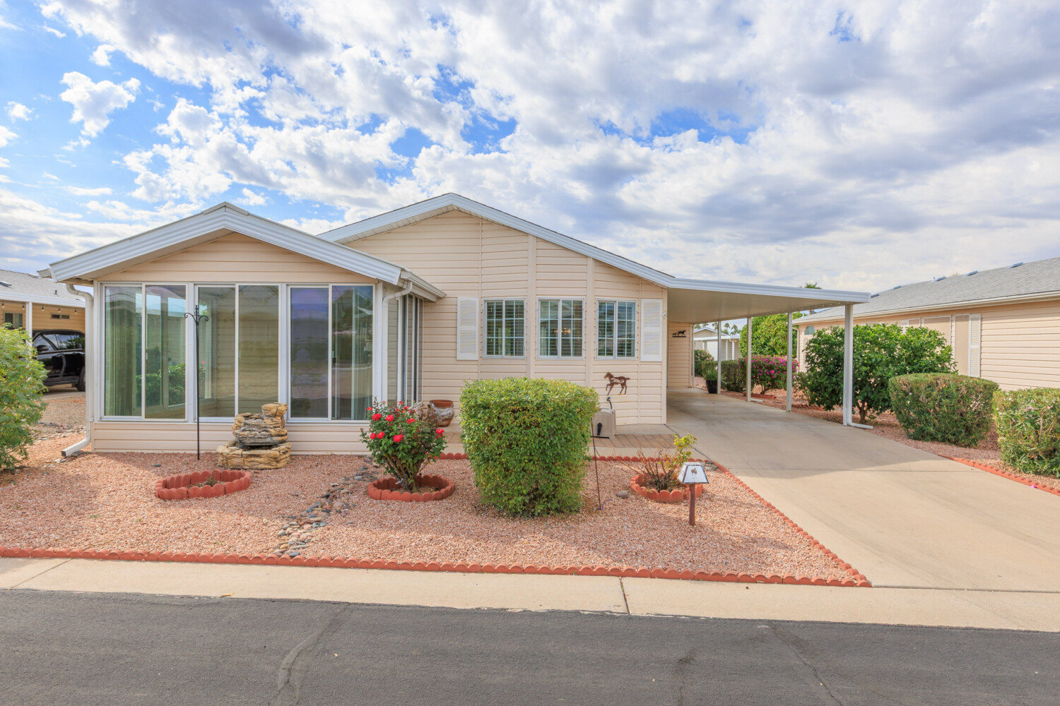 Bright and inviting 2bd/2ba Monterey home featuring a spacious kitchen with bay window, coffee bar, and newer stainless-steel appliances. The primary bedroom accommodates a king set, boasts and extra-long closet, and an updated en suite bath with a step-in shower. The guest bedroom fits a queen set and has a full-size closet. Enjoy vinyl flooring, and indoor laundry room with storage, and outdoor storage shed and a screened in Arizona room – perfect for relaxing or entertaining.