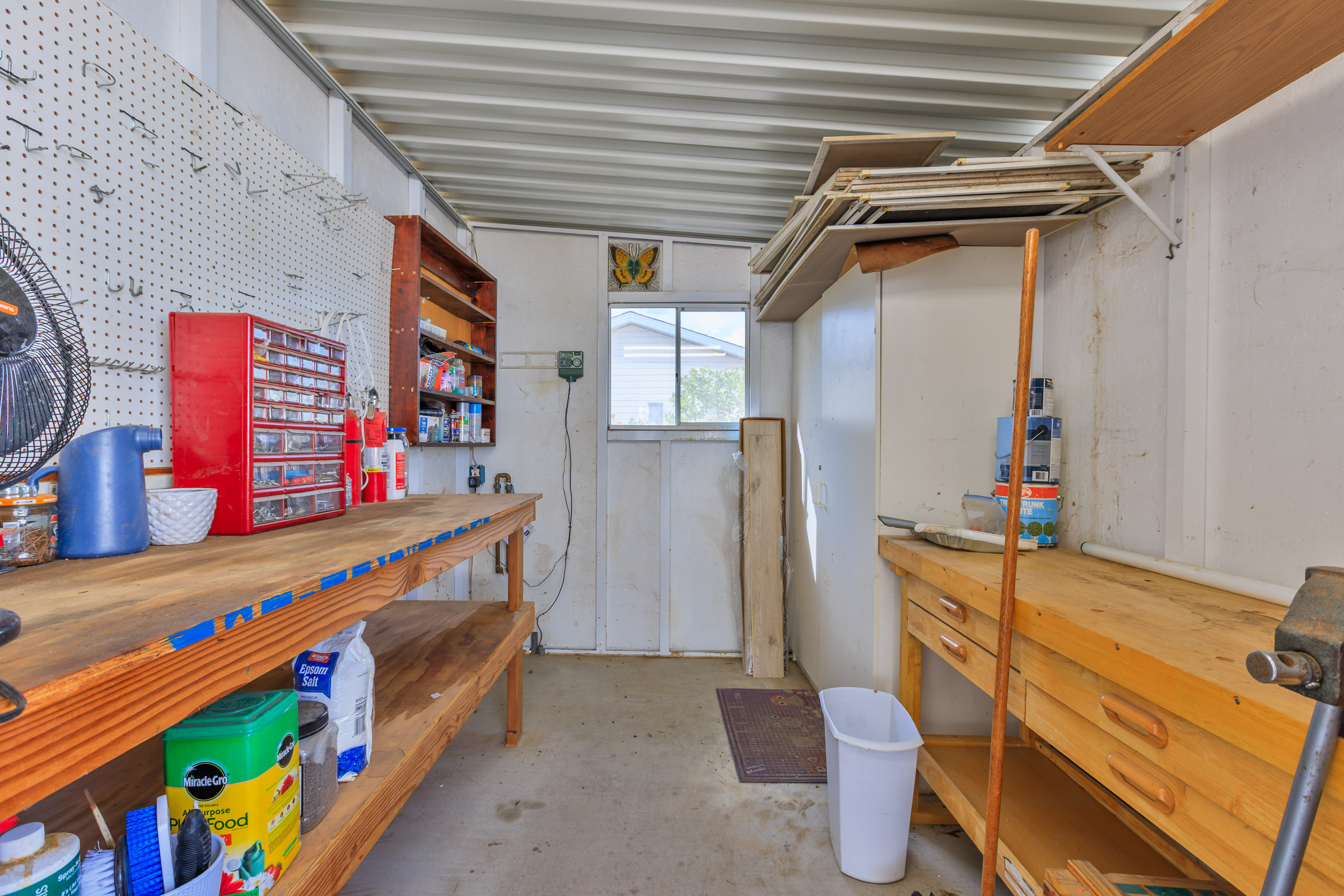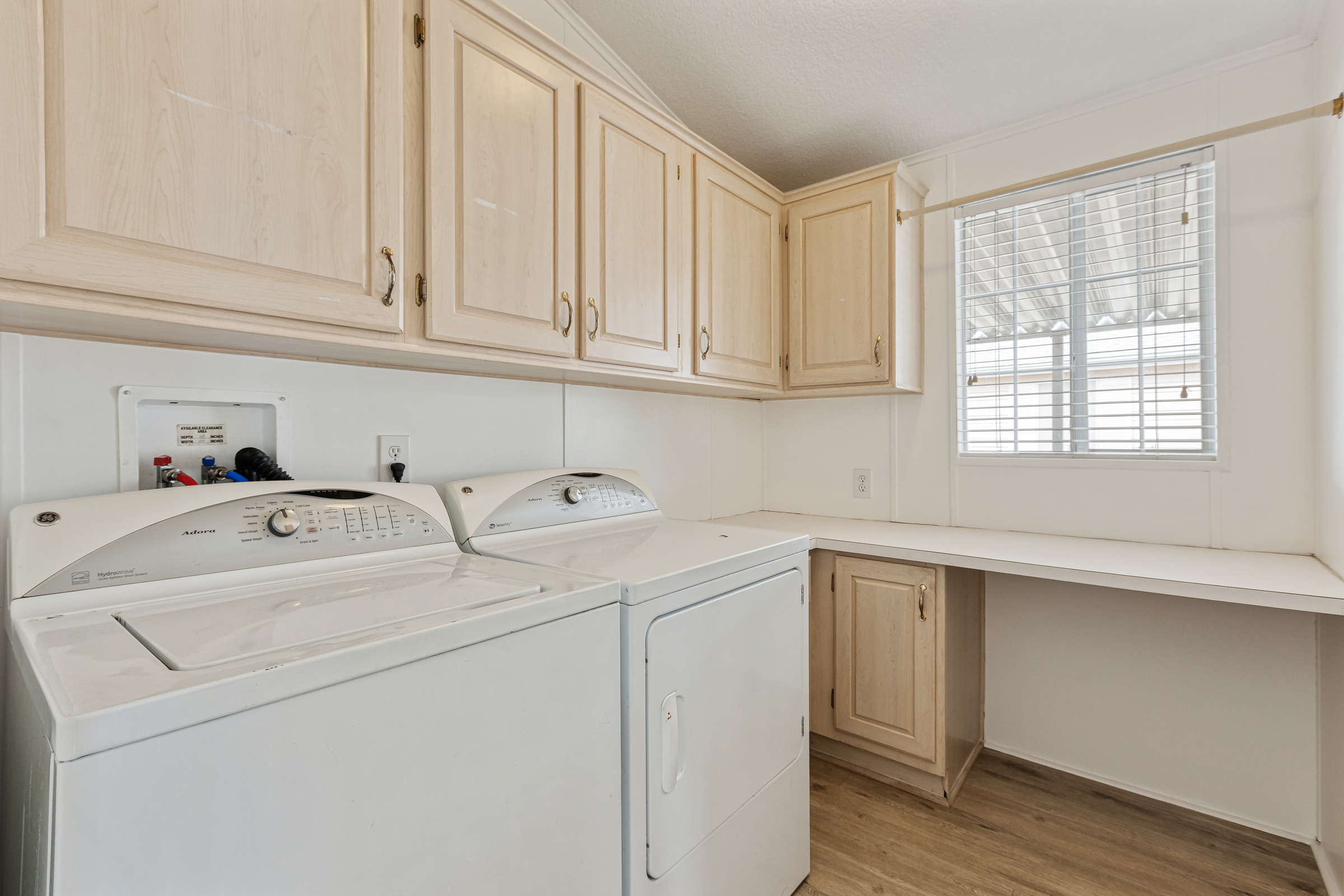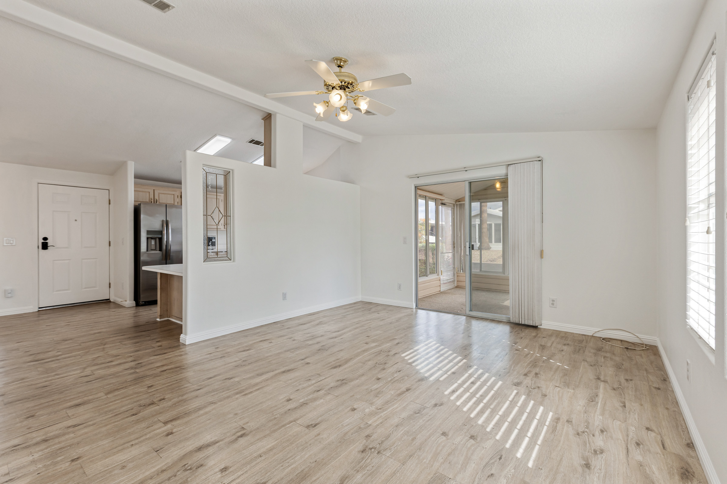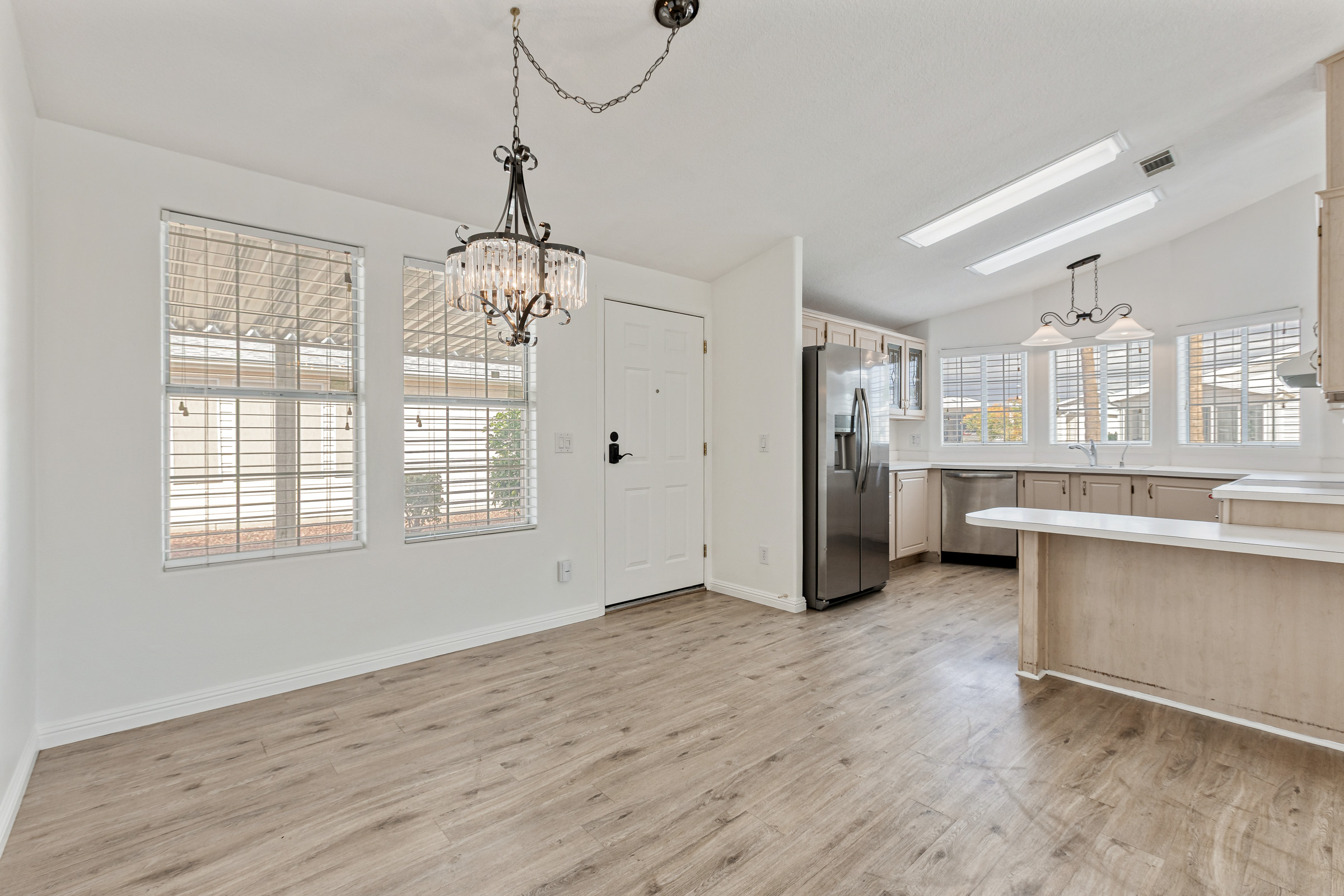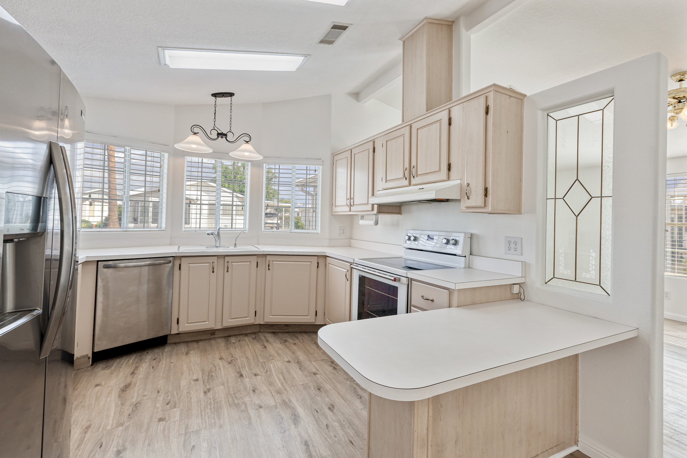 Bright and inviting 2bd/2ba Monterey home featuring a spacious kitchen with bay window, coffee bar, and newer stainless-steel appliances. The primary bedroom accommodates a king set, boasts and extra-long closet, and an updated en suite bath with a step-in shower. The guest bedroom fits a queen set and has a full-size closet. Enjoy vinyl flooring, and indoor laundry room with storage, and outdoor storage shed and a screened in Arizona room – perfect for relaxing or entertaining.