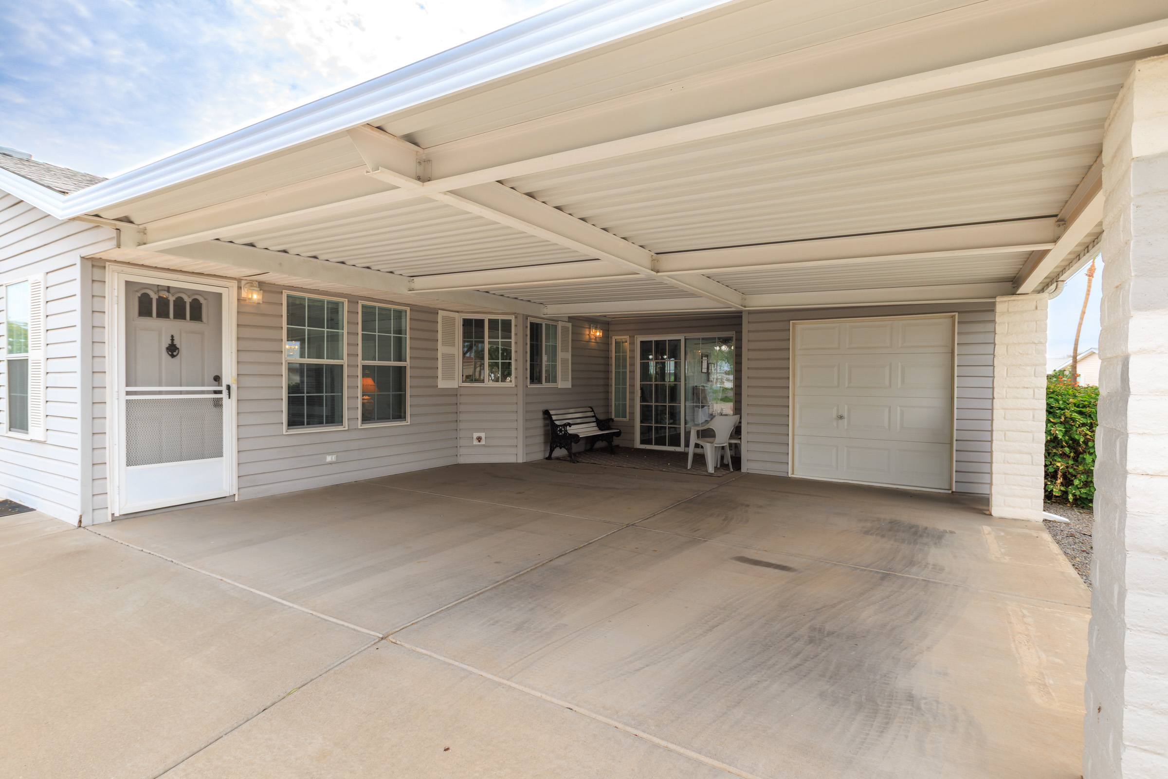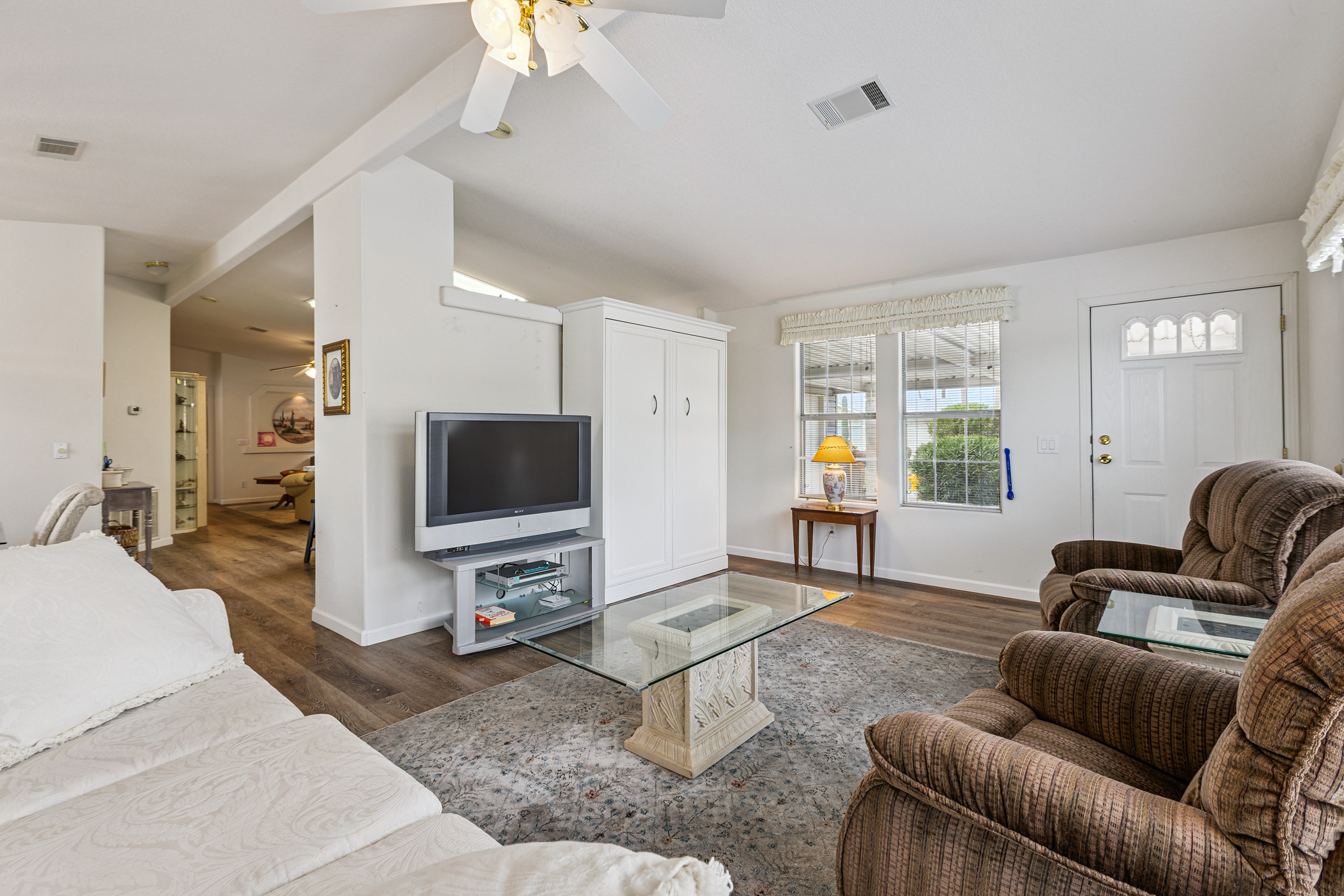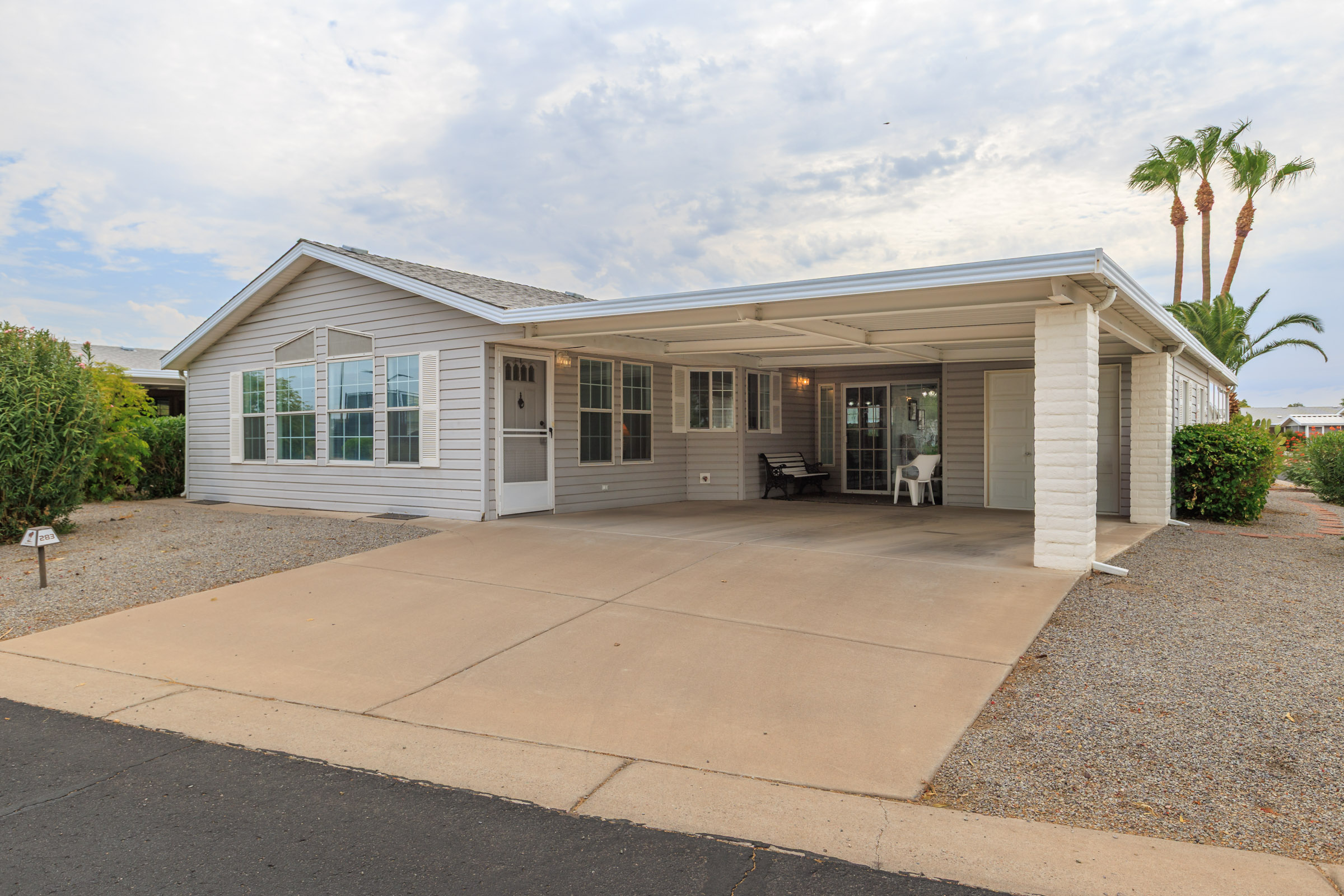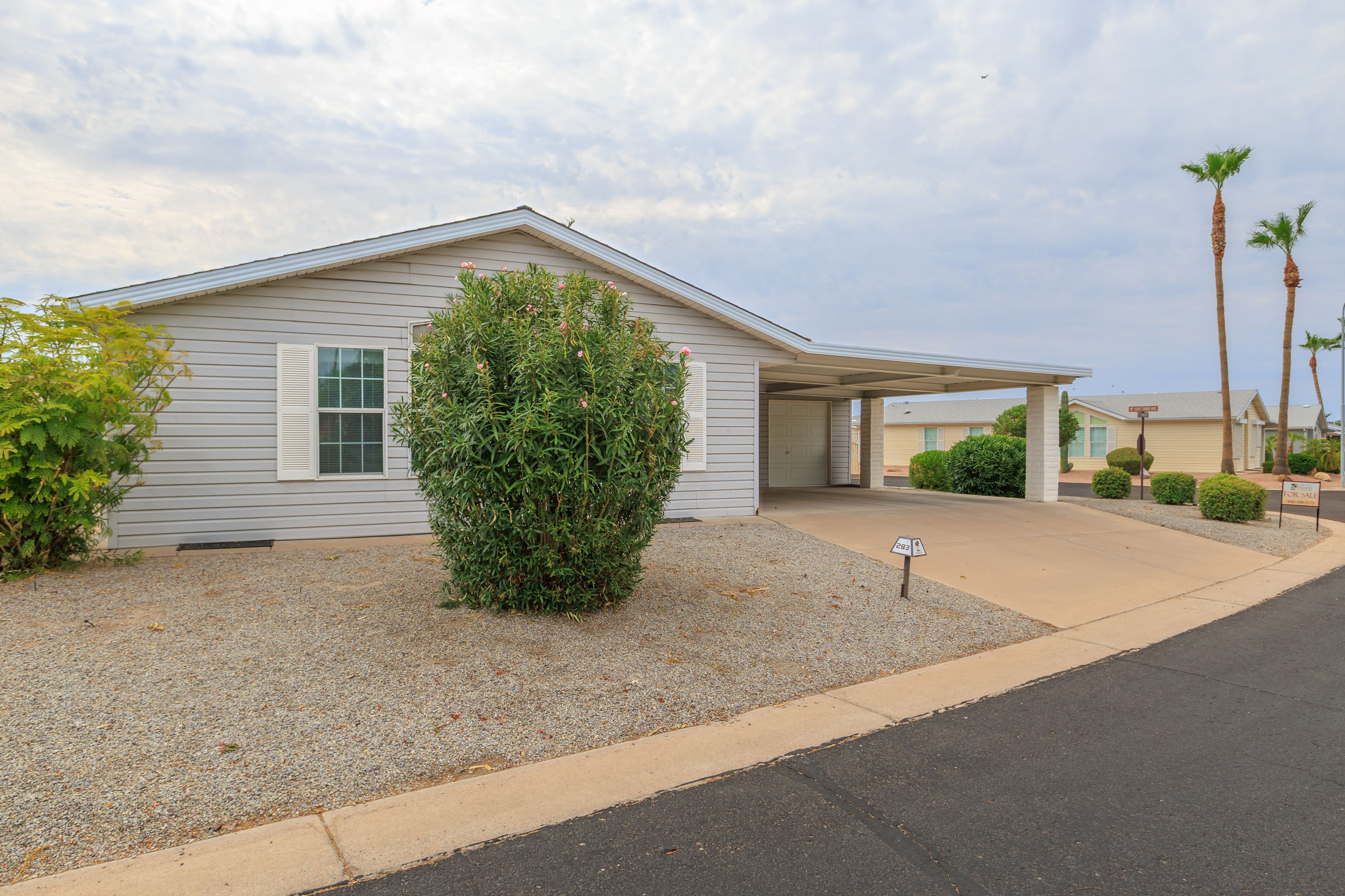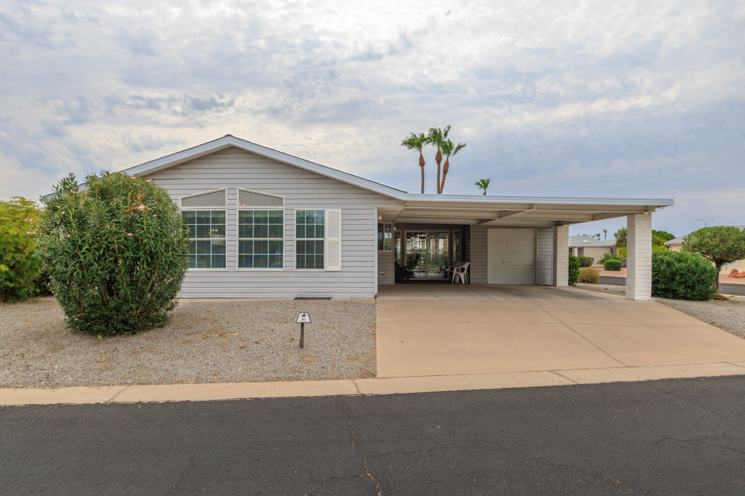 Stunning corner 2BD/2BA home across from the Clubhouse & pool. 1792 SF of inviting charm! The kitchen boasts a sit-at island and stainless-steel appliances. In the dedicated laundry room are newer front-load washer/dryer. This home boasts neutral vinyl flooring throughout. Primary suite boasts double walk-in closets. Relax on the patio – off the large, enclosed AZ room. Enjoy the ease of a SxS dbl carport w/a golf cart garage.