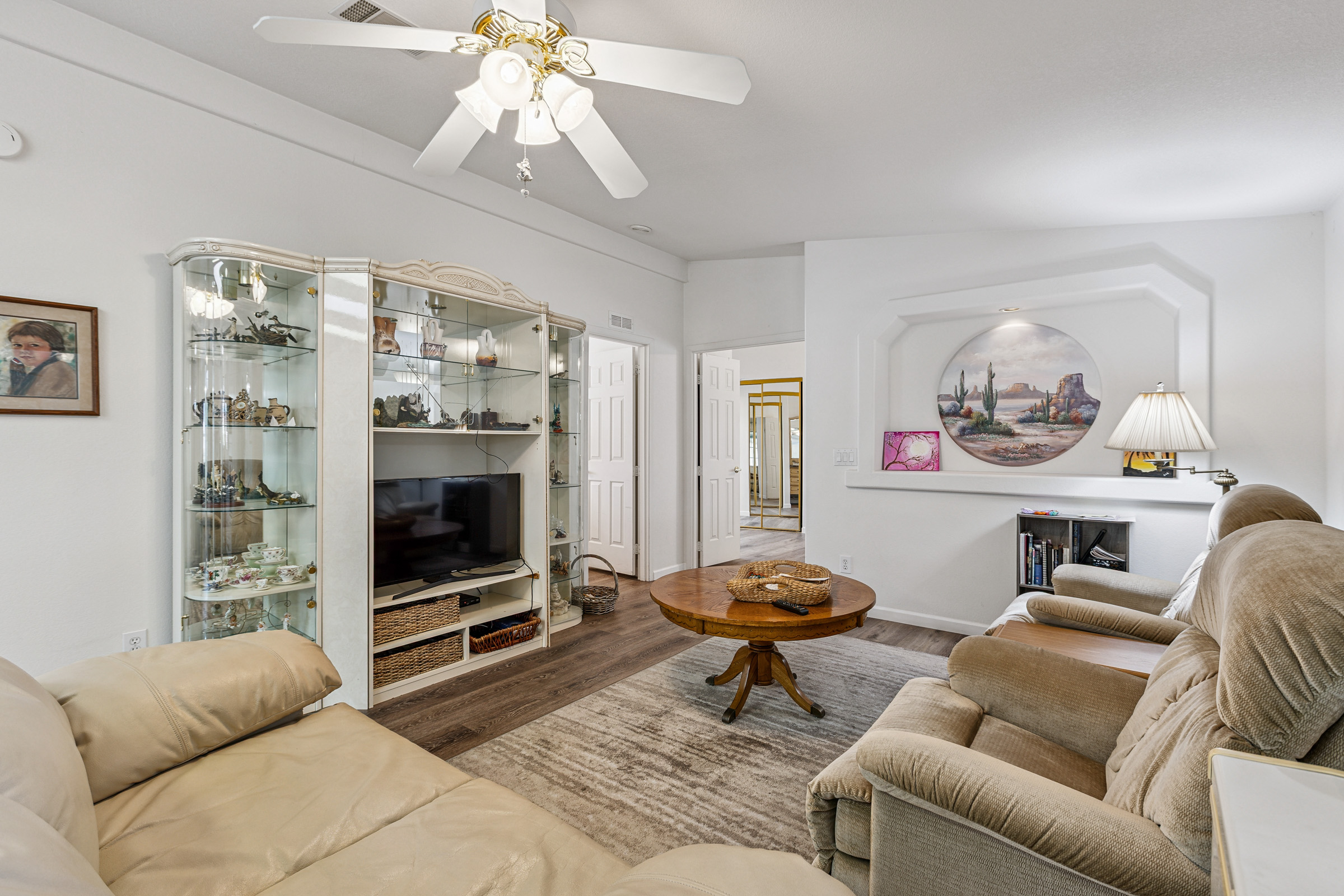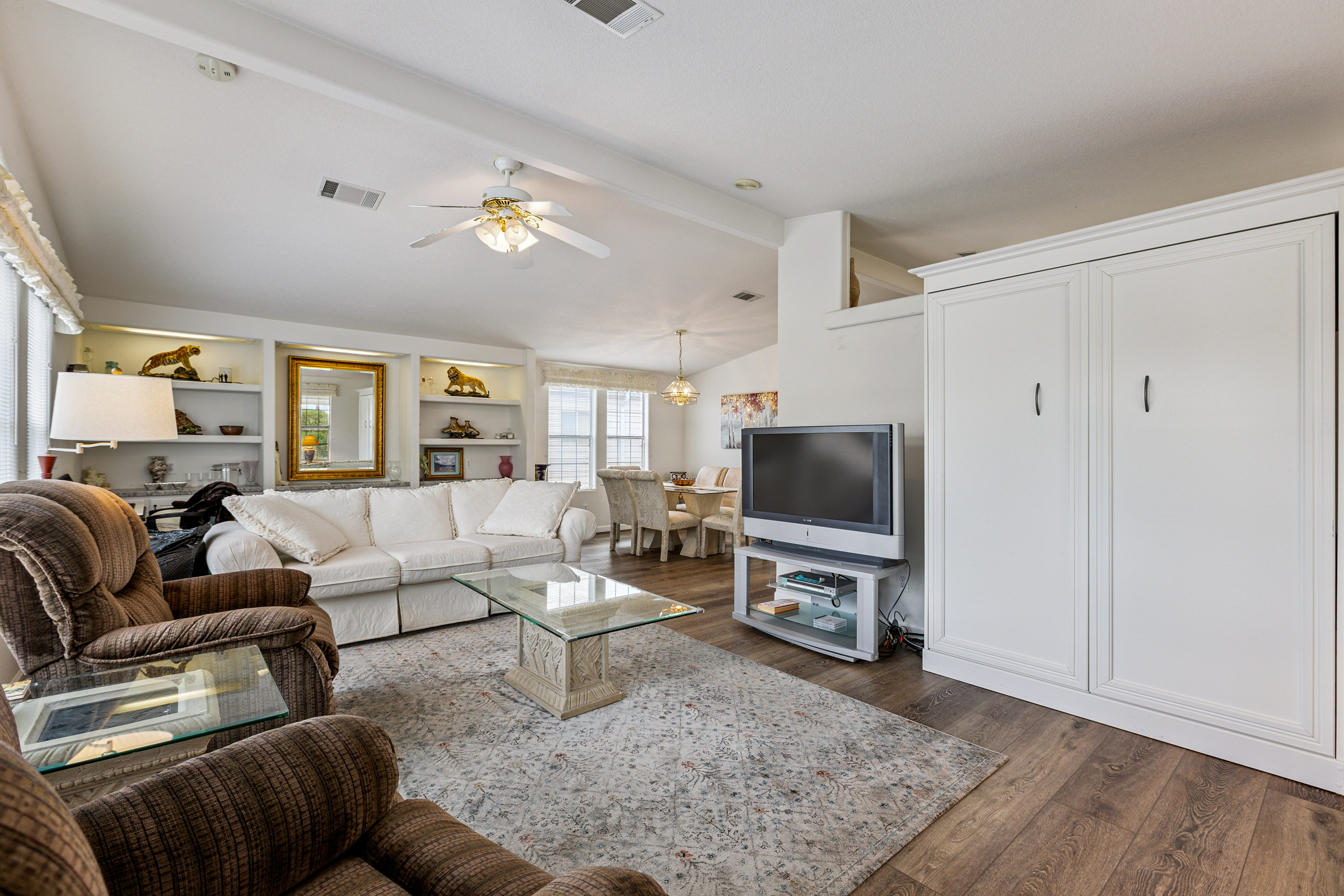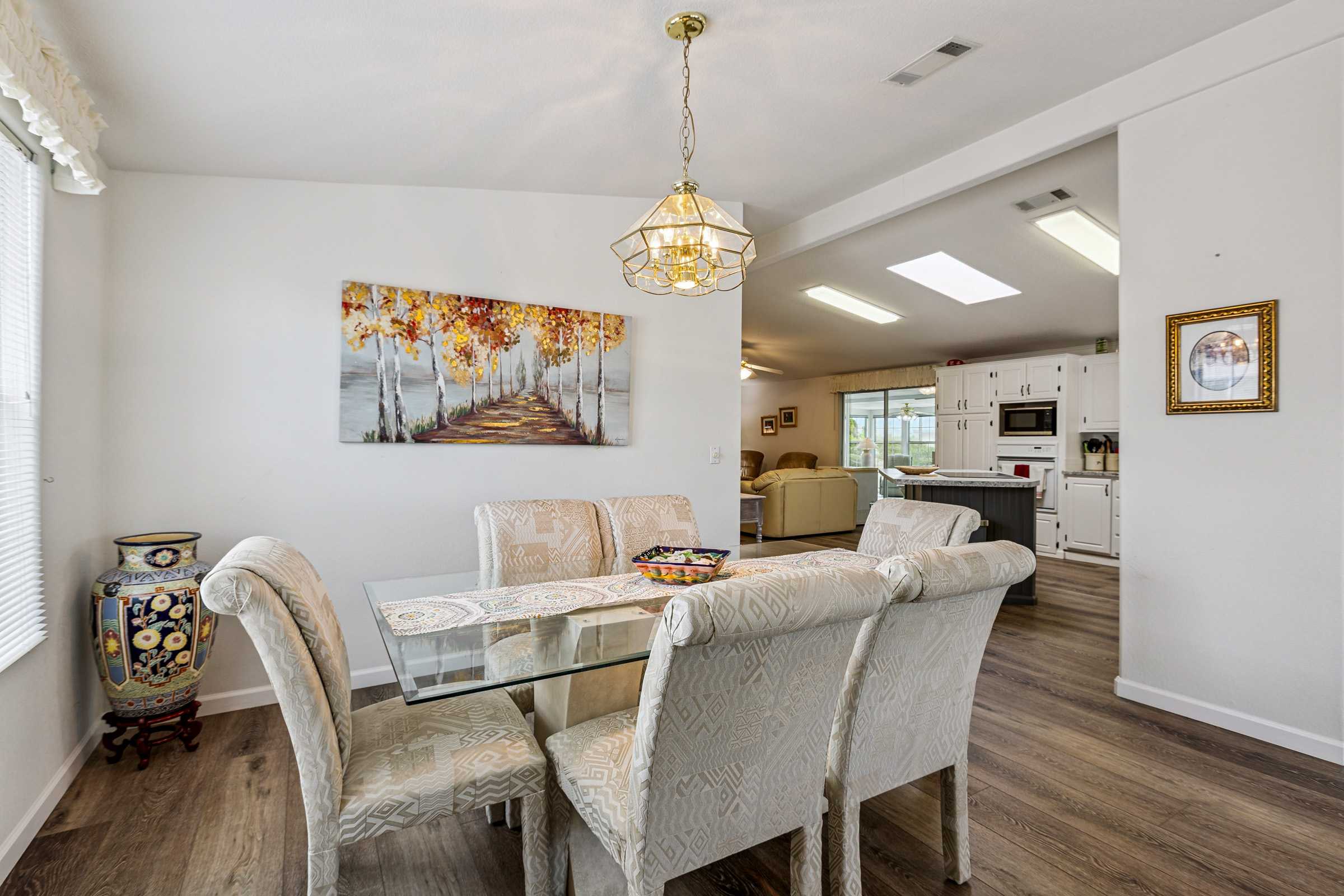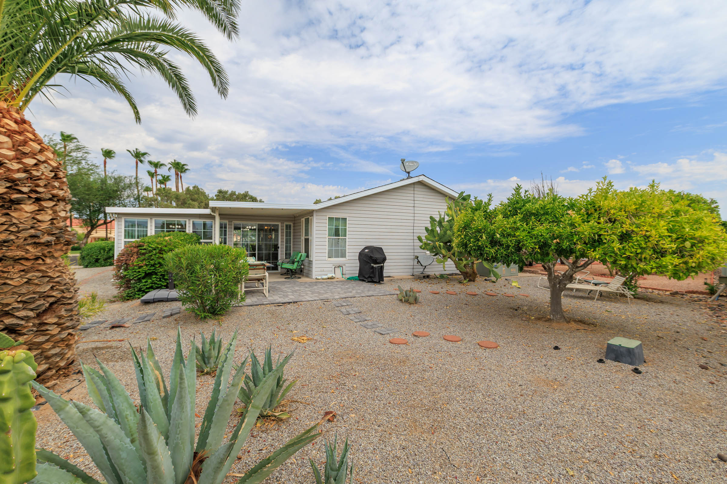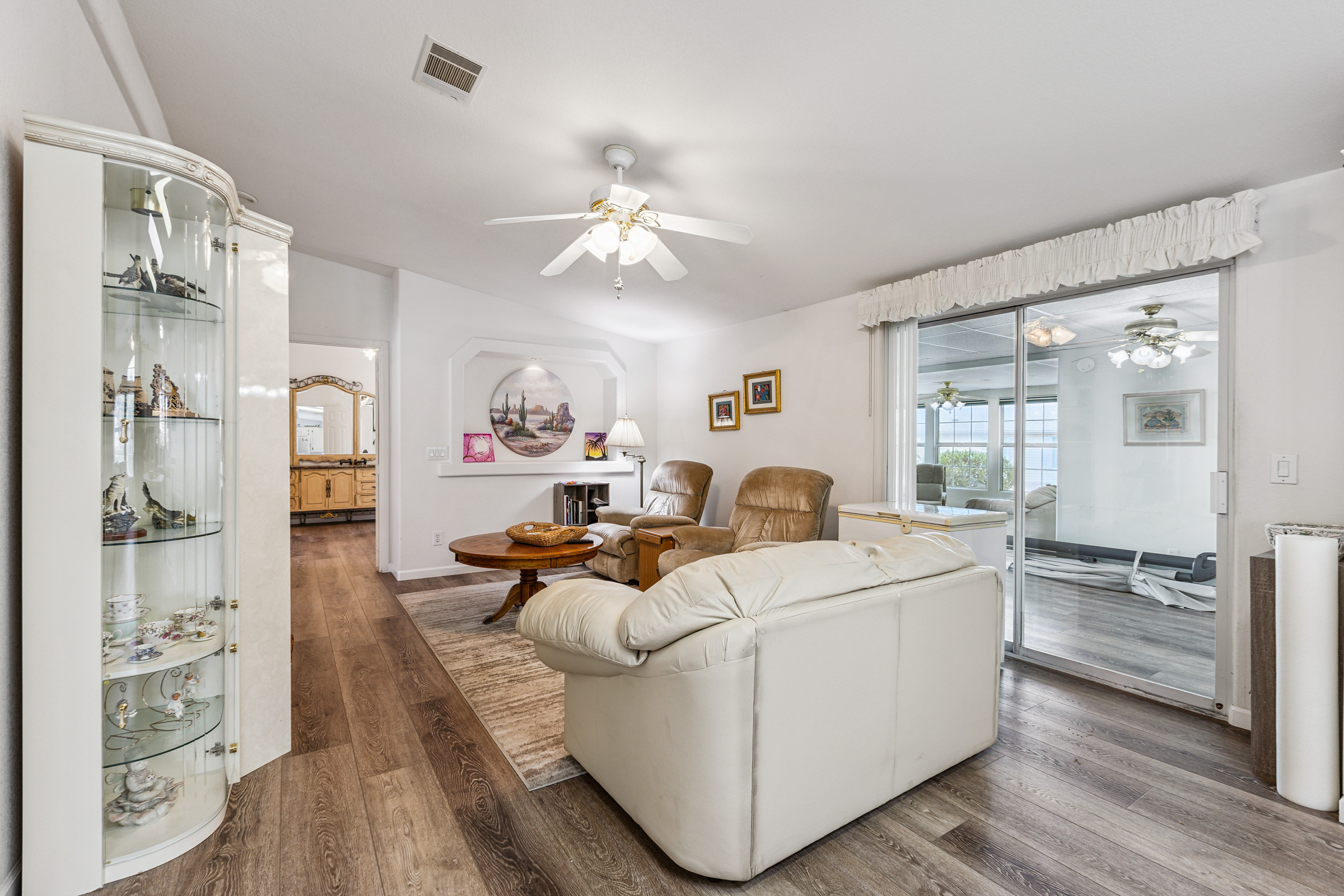 Stunning corner 2BD/2BA home across from the Clubhouse & pool. 1792 SF of inviting charm! The kitchen boasts a sit-at island and stainless-steel appliances. In the dedicated laundry room are newer front-load washer/dryer. This home boasts neutral vinyl flooring throughout. Primary suite boasts double walk-in closets. Relax on the patio – off the large, enclosed AZ room. Enjoy the ease of a SxS dbl carport w/a golf cart garage.